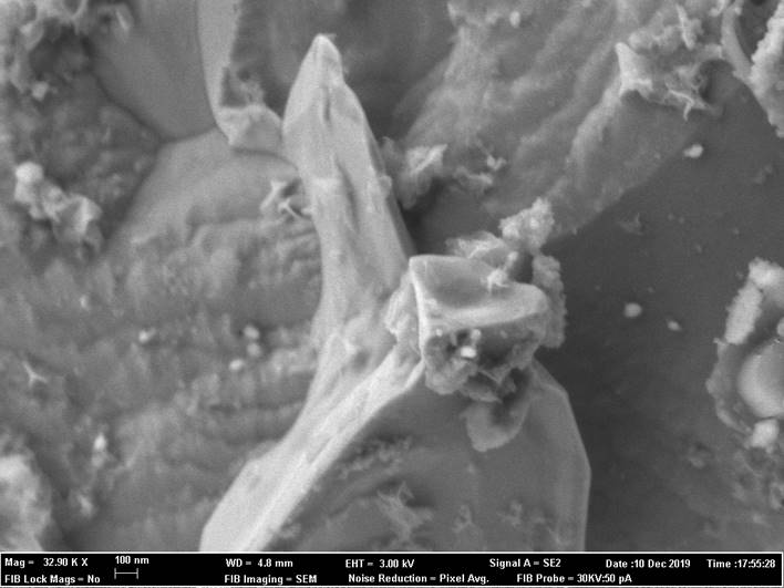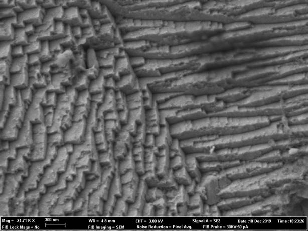 Superficie del acero en el microscopio electrónico de barrido de emisión de campo (FESEM) a 32.900 aumentos, 2019. Servicio de Microscopia electrónica, Universitat Politècnica de València, UPV.