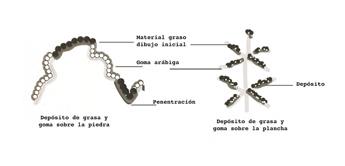 De todas las partes anotadas por Garo Antreasian en su libro The Tamarind book of lithography art & techiniques, sobre los principios que gobiernan el éxito del proceso de creación litográfico en piedra, la más importante aquí es la separación de los depósitos de grasa y goma arábiga en afección al grano (1971, 124).