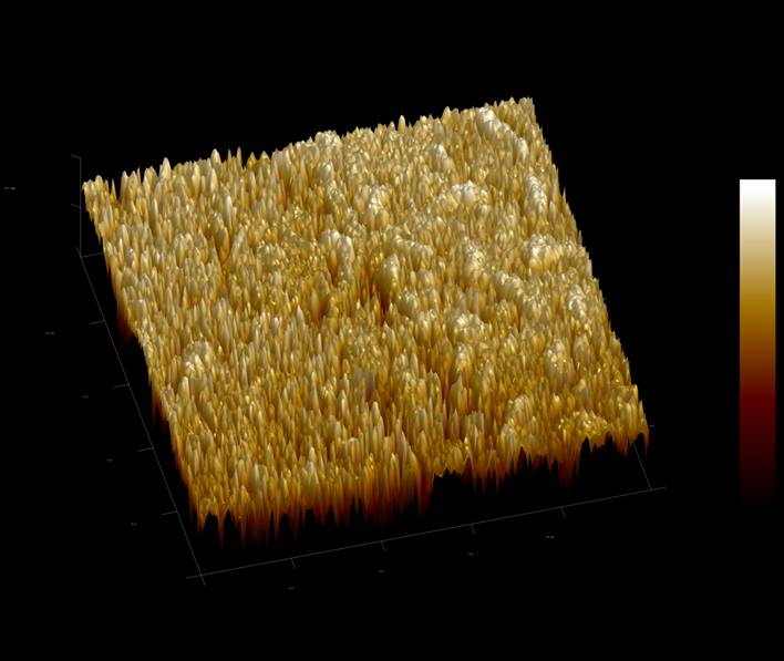 Detalle de la superficie de acero laminado en frío graneado y sensibilizado 3D Ampliación a 250 nm en sistema ATM. Servicio de Microscopia electrónica, Universitat Politècnica de València, UPV.