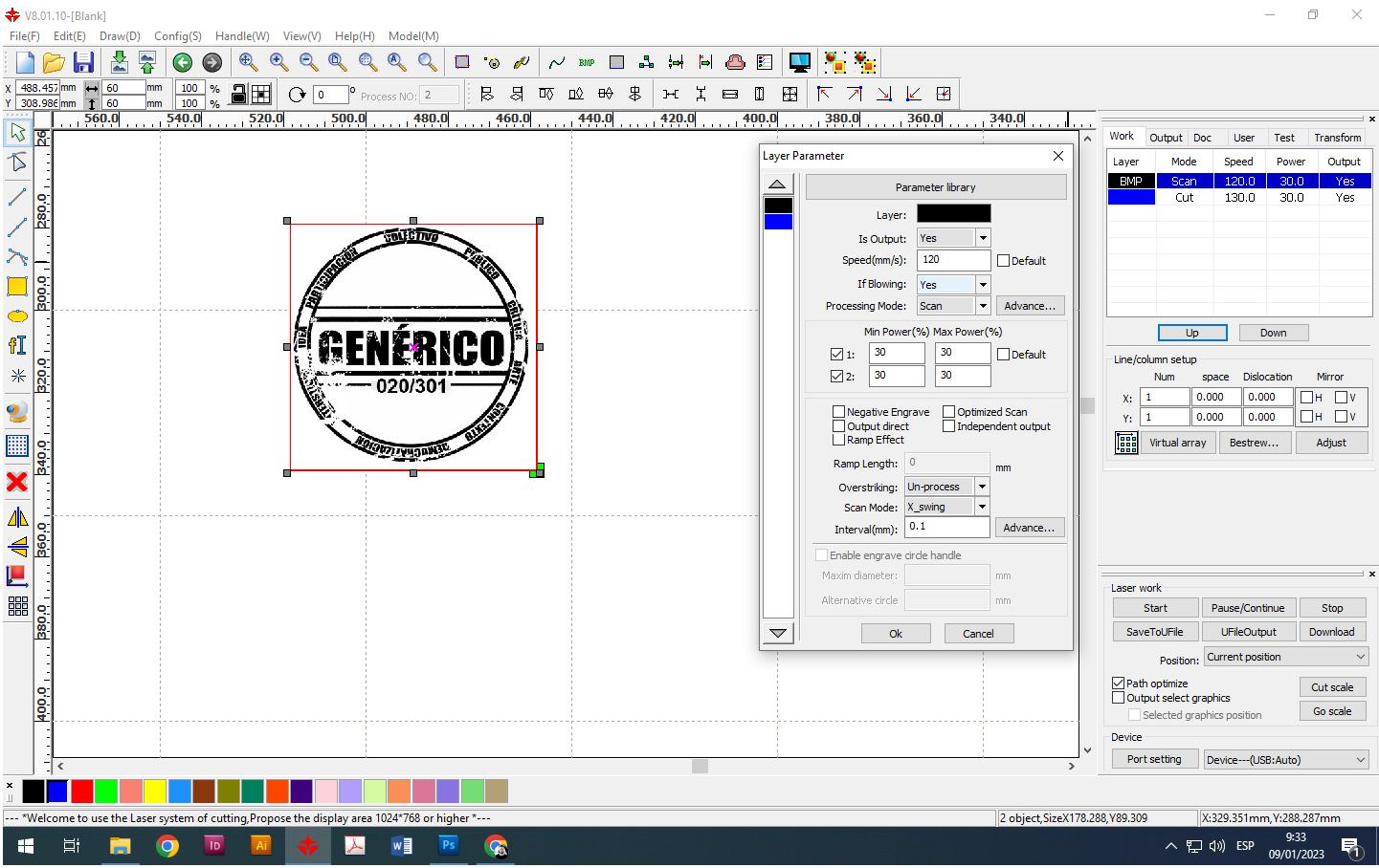 Tras cubrir el metal con vinilo adhesivo, hemos procedido a posicionar la plancha de metal dentro de la cortadora láser para retirar el vinilo mediante el haz dirigido que produce la máquina. De este modo eliminamos el plástico cubriente y podemos generar una traslación fidedigna de nuestra imagen digital a la matriz metálica.