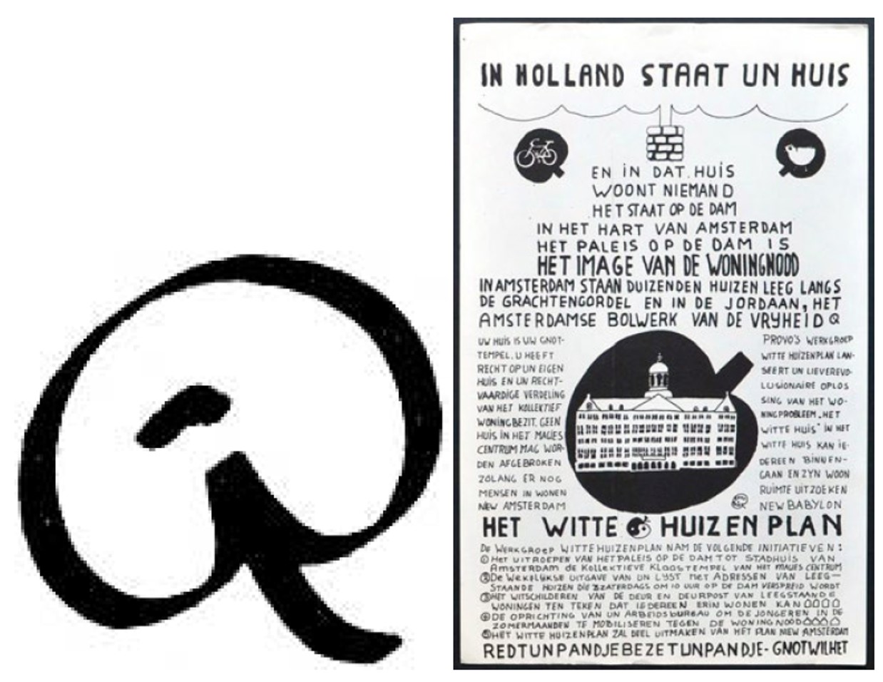 El blanco es el color de la oposición y la protesta, pero representa también las posibilidades de aquello que está aún por escribirse. El mejor ejemplo son los Planes Blancos: iniciativas impulsadas por distintos miembros del grupo ideadas para cambiar determinados aspectos de la vida en la ciudad. Los planes más destacables, aquellos que lograron consenso para ser incluidos en la campaña electoral de Provo en las elecciones al Ayuntamiento de Ámsterdam, fueron: el Plan de la Chimenea Blanca y el Plan de la Bicicleta Blanca, ambos destinados a combatir la contaminación del aire; el Plan del Pollo Blanco, que proponía la transformación del cuerpo de policía en un cuerpo de trabajadores sociales; el Plan de la Vivienda Blanca, ideado para luchar contra la falta de vivienda por medio de la ocupación de edificios vacíos en la ciudad, incluido el Palacio Real; el Plan de las Mujeres Blancas, según el cual se proporcionaría a las mujeres jóvenes educación sexual y medios anticonceptivos; el Plan de los Colegios Blancos, que otorgaba gran importancia a la participación del cuerpo estudiantil organizado en asambleas; y el Plan de la Ciudad Blanca, por el que Ámsterdam se convertiría en la primera ciudad lúdica siguiendo el modelo de la Nueva Babilonia de Constant Nieuwenhuys4. Más allá de su comunicación pública durante la campaña electoral, los Planes Blancos se materializaron parcialmente en distintas actividades organizadas por Provo en la ciudad. Frente a la oscura realidad contra la que se alzaban los grupos juveniles: frente al humo negro y contaminante de los coches, a la falta de hogares y a la violencia policial, el color blanco representaba la alternativa. En definitiva, fue el color de la protesta y las pintadas, pero también el de las propuestas ofrecidas por Provo para la renovación, lúdica y revolucionaria, de las formas de vida en la capital neerlandesa.