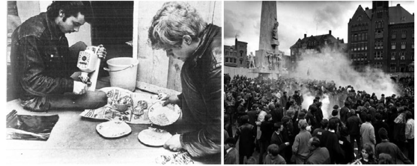 La revuelta provotaria carecía de instrucciones claras y tuvo siempre el carácter de una improvisación creativa en la que participó un número creciente de personas. Del hecho de que algunas de esas personas, artistas de difícil clasificación y activistas en su mayoría, tenían conocimiento del trabajo artístico Kaprow no existe ninguna duda. En una de las reuniones en el Lieverdje, Luud Schimmelpennik sujeta un cartel manuscrito con letras blancas en el que es posible leer «el teatro de la policía de Ámsterdam presenta Happenings holandeses en cuatro actos» (Kempton 2015). Un título irónico que alude claramente al primer happening de Kaprow en 1959 y que, al mismo tiempo, resulta una crítica a las actuaciones violentas de la policía, cada vez más frecuentes, contra las actividades del grupo en el espacio público.