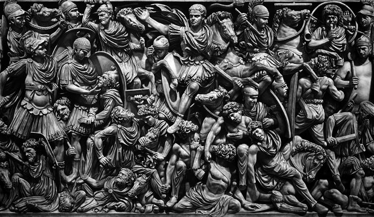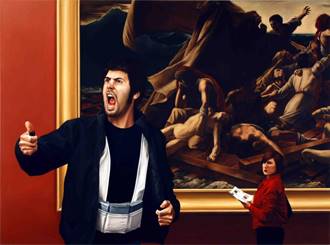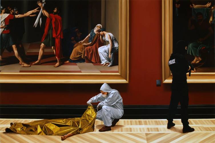 Imagen cedida por el artistaComo hemos podido observar en sus últimas series de obras, los bustos escultóricos y las estatuas provenientes de la historia del arte han tenido una gran influencia en Garraza. Sin embargo, otra de sus grandes inspiraciones ha sido el género de pintura de historia. En relación a ello, Paco Barragán (2014) considera que una parte del arte posmoderno ha recuperado el género de pintura de historia desde un enfoque de cuestionamiento. En este sentido, apunta que algunos artistas crean lo que denomina como «anti-pintura de historia». Esta, según explica, lejos de emplear los elementos más característicos del género, trata sucesos de la actualidad económica, social y política desde una aproximación reflexiva, discordante o indefinida. Por su parte, Javier González de Durana (2015), en relación con las obras pertenecientes a la serie «This is the end of the world as you know it» (2015) de Garraza, encuentra un nexo entre las mismas con el género de pintura de historia, debido principalmente a las coincidencias existentes en cuestiones compositivas, de representación y de querer plasmar una narración. A pesar de ello, también observa divergencias. Según explica, la pintura de historia trataba acontecimientos pretéritos de relevancia, en contraposición a la obra de Garraza, quien desde la actualidad imagina y plantea un hipotético porvenir. Con todo, González de Durana advierte que los pintores del siglo XIX también emplearon su creatividad e ingenio en sus propias piezas, y que no siempre reflejaron en las mismas los acontecimientos de manera fehaciente.