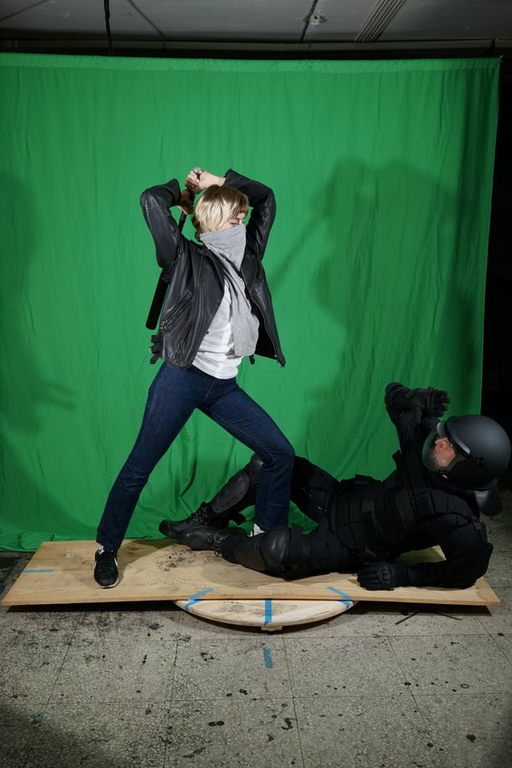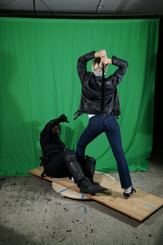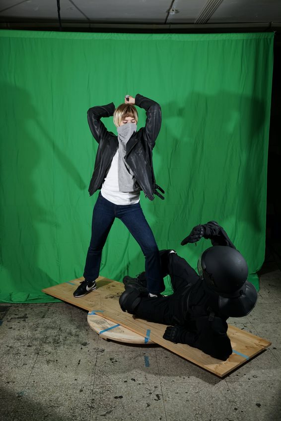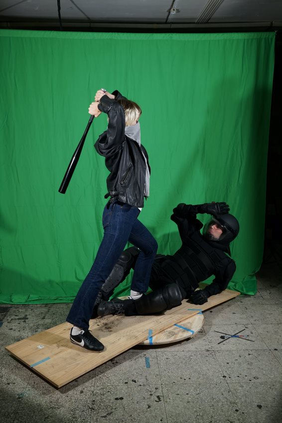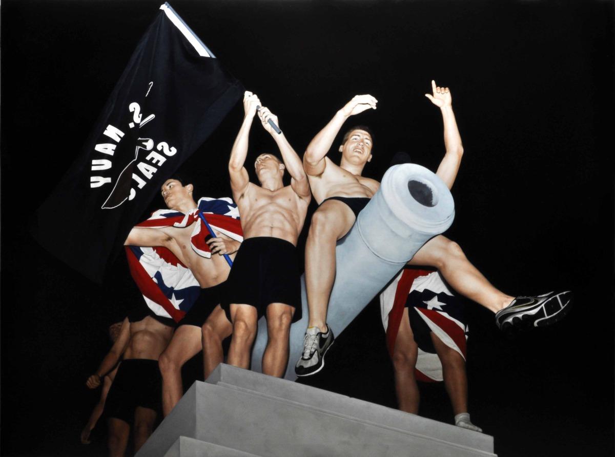 Imagen cedida por el artistaCuando tiene que trabajar con modelos en su estudio, suele emplear elaborados procesos de caracterización, preparando con gran detalle las tomas fotográficas. En este sentido, Barragán, en referencia a la serie «Osama» (2013), señala que Garraza «recurre al género de historia para recrear una contravisualidad teatralizada, dramática y sensacionalista (...) no duda en mezclar personajes de ficción y personas reales, héroes y anti-héroes, con familiares y amigos (...) a fin de reproducir una escena creíble» (Barragán 2014, 114-115). Del mismo modo, Ángel Calvo Ulloa (2014) destaca la elaborada puesta en escena que realiza Garraza antes de pintar, y encuentra similitudes con el proceder del fotógrafo Andrés Serrano (1950). Según explica, el estadounidense brinda más importancia a los preparativos previos que a la propia captura fotográfica.