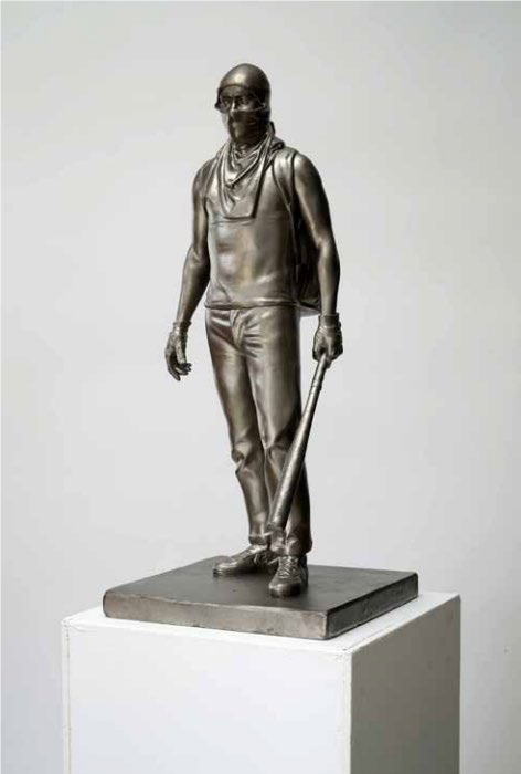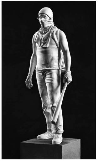 Imagen cedida por el artistaEs de gran interés ver cómo la obra de Garraza ha evolucionado con los años, desde plantear críticas al establishment del arte, pasando por representar mundos distópicos, hasta reflexionar sobre la consagración de las figuras de poder a través de las esculturas. Todo ello, como decimos, empleando un lenguaje pictórico que ha ido también enriqueciéndose con el paso del tiempo. A este respecto, Raffaele Quattrone opina que Garraza ha revitalizado un realismo que se consideraba caduco, a través de la creación de piezas que se nutren de los medios de información y del cine. Añade que el artista «a menudo construye sus obras siguiendo una delgada y frágil línea de demarcación que separa lo hiper-real de lo irreal» (citado en Di Fabio & Garraza 2017, 14).