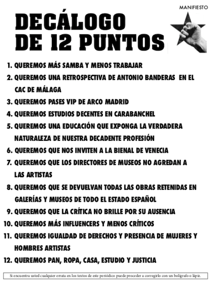 El artista, en la institución artística, es el proveedor de la mercancía, y aparece su nombre porque está pegado a ella, porque forma parte del pack, porque el artista es también mercancía. Un artista es aquel que provee de la mercancía artista-obra-de-arte a las entidades o instituciones que la requieren para su buen funcionamiento. Para mí, esa es la definición de artista a partir de la cual se puede legislar un estatuto. Las disciplinas artísticas no pintan nada, nunca mejor dicho. Un artista profesional no es lo que hace, es a quién provee, es las necesidades o demandas que cubre.