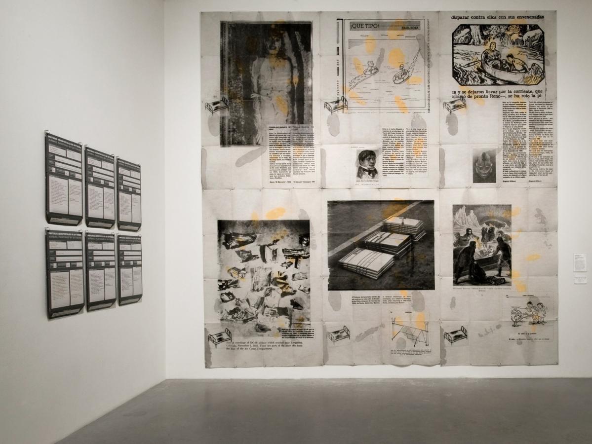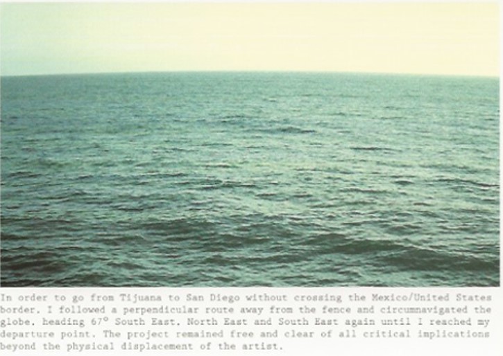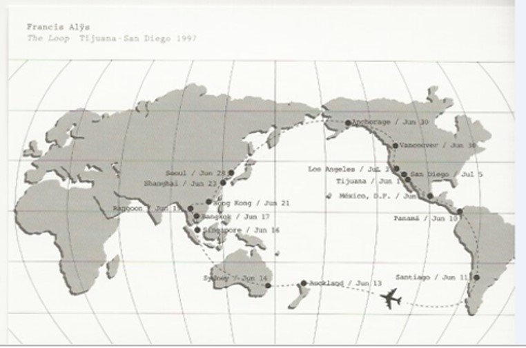 Por otra parte, el proyecto de Francis Alÿs en «The loop» traza también unas líneas que es posible seguir para reconstruir el desplazamiento del artista. En 1997 fue invitado a participar en la muestra internacional InSITE que ponía el foco en el contexto de la región fronteriza San Diego-Tijuana. Evitando cruzar la frontera entre México y Estados Unidos, cuya conflictividad no ha hecho más que aumentar en los últimos años, Alÿs emprende un viaje de 29 días y 16 ciudades, registrando las escalas y fechas del mismo en un mapa en formato postal. Como una hoja de ruta que combina de nuevo escritura e imagen, el artista describe los movimientos a realizar: «tomaré una ruta perpendicular a la banda divisoria. Desplazándome 67º SE, luego hacia el NE y de nuevo hacia el SE, circunnavegaré la Tierra hasta llegar al punto de partida. Los objetos generados por el viaje darán fe de la realización del proyecto, que quedará libre de cualquier contenido crítico más allá del desplazamiento físico del artista»2. De este modo, Alÿs invierte el presupuesto de la exposición en un viaje en avión de Tijuana a Ciudad de México, pasando luego por Panamá, Santiago, Auckland, Sídney, Singapur, Bangkok, Rangún, Hong Kong, Shanghái, Seúl, Anchorage, Vancouver y Los Ángeles para finalmente aterrizar en San Diego, no demasiado lejos del punto de partida. Con este impresionante cambio de escala en la propia concepción del viaje pone en marcha una manera, indiscutiblemente privilegiada, de burlar el paso fronterizo. Invirtiendo una gran cantidad de esfuerzo para lograr un mínimo resultado, «The loop» evidencia una comprensión de la complejidad de lo liminar como frontera geográfica pero también política. Así mismo, según Graciela Speranza este torbellino de movilidad al que Alÿs se somete podría interpretarse como «una ironía sobre el turismo del viajar sin ver y la superficialidad mundana de la vida del artista globalizado» (2012).