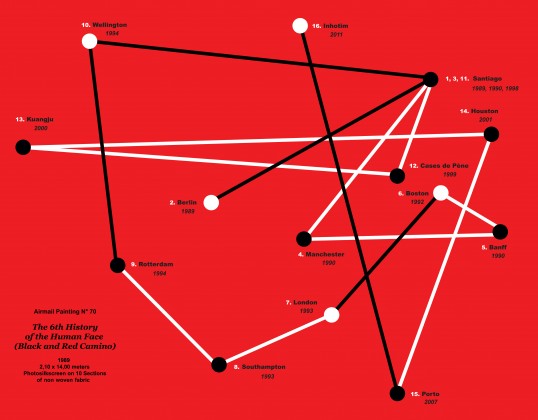 Como apuntaba Onfray, durante el vuelo se cruzan fronteras que pasan completamente inadvertidas para los pasajeros, pero en el acceso al mismo suelen desplegar su violencia burocratizada, sus restricciones y prohibiciones. Fue precisamente durante la dictadura de Pinochet cuando el chileno Eugenio Dittborn comenzó a trabajar en sus pinturas aeropostales. Se trata de trabajos bidimensionales que pliega cuidadosamente o introduce por secciones en un sobre que luego es enviado por correo postal aéreo. A pesar de su mediano tamaño, estos sobres, que son siempre expuestos junto a las pinturas desplegadas, son contenedores de un amplio espacio conceptual y geográfico. En un breve ensayo con ocasión de la última exposición del artista en la galería Alexander and Bonin, Laura Braverman realiza una observación interesante cuando repara en el hecho de que a menudo las rutas aéreas de estas pinturas «han sido representadas en los catálogos del artista como líneas que atraviesan la superficie de la Tierra» (Braverman 2018). El recorrido de las pinturas aeropostales es acumulativo, en tanto el itinerario está definido por su exposición en galerías, museos e instituciones de diferentes países. Un ejemplo es la pintura aeropostal nº 70, que ha pasado por ciudades tan distantes como Londres, Berlín, Rotterdam, Boston, Santiago… Dittborn lleva la cuenta de esta circulación constante que, «en el mapa del mundo» es «como una escritura a escala gigantesca» (Braverman 2018). La relación de las pinturas aeropostales con la escritura es doble. Por un lado, en su desplazamiento a gran escala actúan como trazos-líneas en el cielo, por otro, la palabra escrita también está presente en los sobres enviados por el artista. En muchos casos se trata de una escritura enigmática, que intenta desentrañar el proceso que conduce a la pintura aeropostal, alude a su contenido simbólico, la itinerancia o la elástica relación entre el destinatario y el remitente. Estos trabajos de Dittborn difuminan el dualismo entre pintura y escritura, contenido y continente, en el momento en que el sobre es expuesto junto a la pintura como un conjunto indiscernible que disputa la mirada.