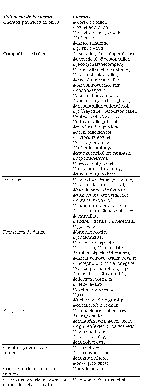 Base de datos fotográfica histórica. Se crea una base de datos fotográfica histórica basada en la información disponible en internet y redes sociales de compañías de ballet, bailarines y fotógrafos de danza. La información de Instagram se ha tabulado y se presenta a continuación (tabla 1)