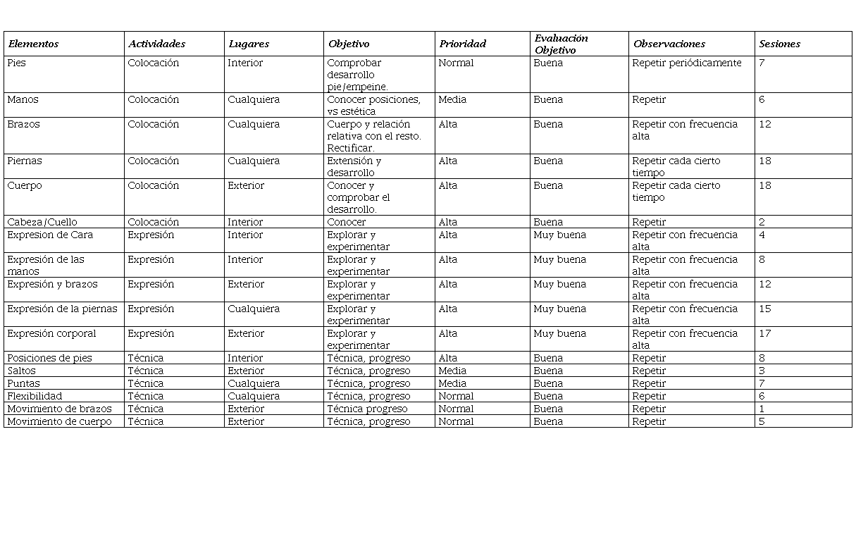 El plan de trabajo realizado, con los elementos trabajados y observaciones, se presenta en la tabla resumen (tabla 2), cuya información se extrae de una hoja de cálculo. La hoja de cálculo contiene todos los elementos trabajados y observaciones, que a efectos prácticos es un cuaderno de trabajo. El número de sesiones ha sido 23 y la frecuencia ha sido semanal, realizando una sesión como mínimo por semana. Los elementos se han definido como partes del cuerpo y técnicas específicas del Ballet clásico, incluyéndose solo los trabajados Tabla 2. Elementos de trabajo. Descripción breve del tipo de trabajo.