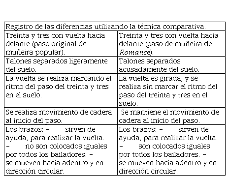 En la tabla I, se determinan las diferencias que existen entre el paso del treinta y tres con vuelta hacia delante originario, y el paso del treinta y tres con vuelta hacia delante de la muñeira que aparece en Romance: