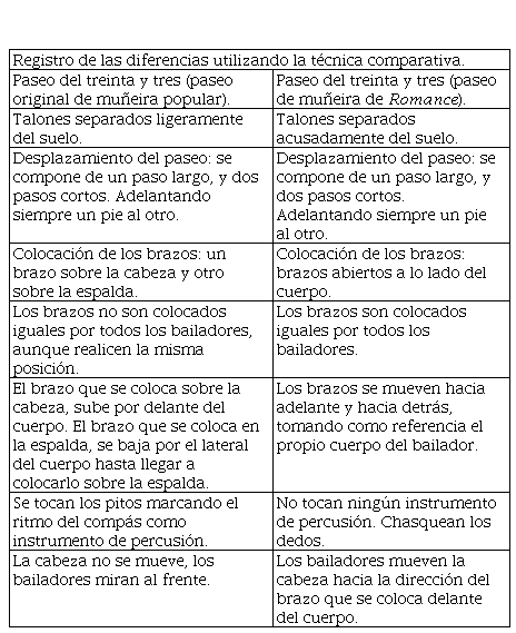 Elaboración propia (2018).En la tabla II se determinan las diferencias que existen entre el paseo del treinta y tres originario y el paseo del treinta y tres de la muñeira que aparece en Romance: