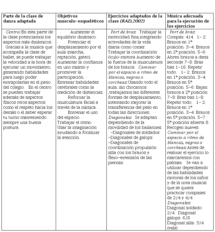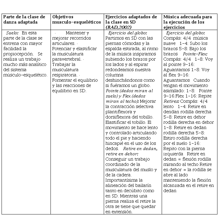 A continuación, se muestran unas tablas con una batería de ejercicios seleccionados de la clase adaptada, extrapolables a la vida diaria de nuestros bailarines, especificando los objetivos que se buscan a nivel músculo-esquelético y la música adecuada para su ejecución.