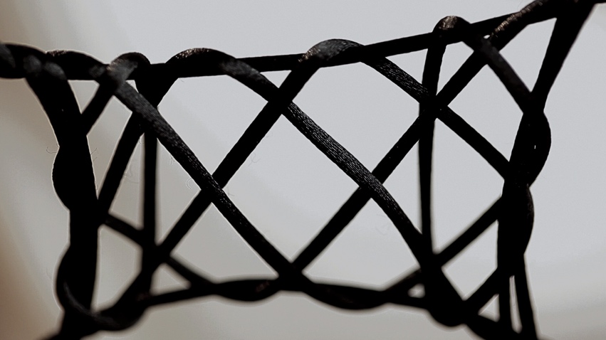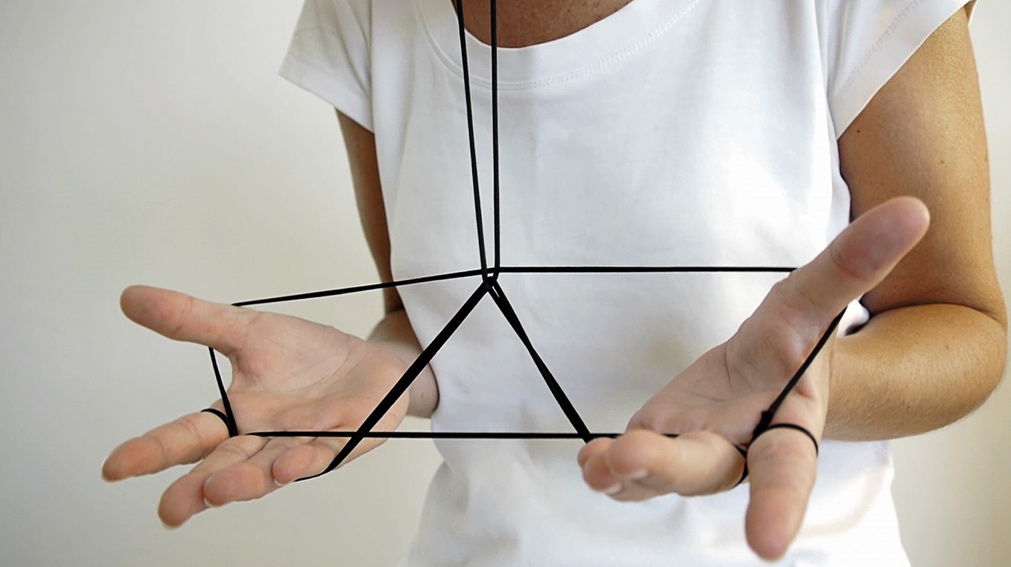 © Eva LootzEn la pieza visual «Entremanos» se observa cómo un cordel anudado se sostiene por los dedos de una persona y se transmite a las manos de la otra persona generando figuras complejas y diversas. El enfoque de la artista resalta la importancia antropológica y cultural de los juegos de nudos en sociedades tradicionales, así como su relación con el desarrollo de habilidades lingüísticas y la colaboración en actividades comunitarias.