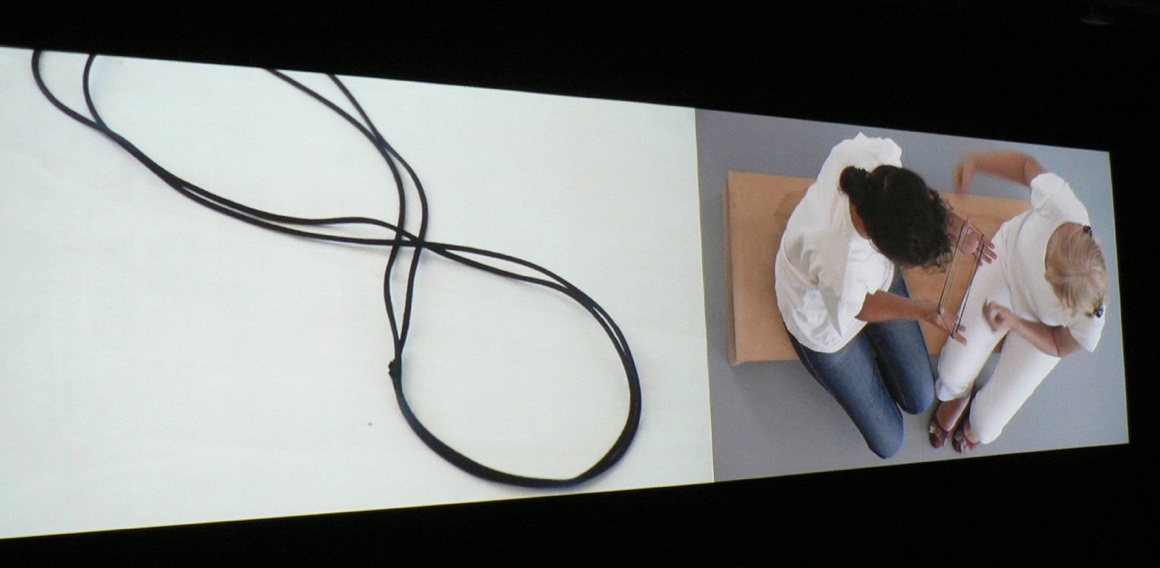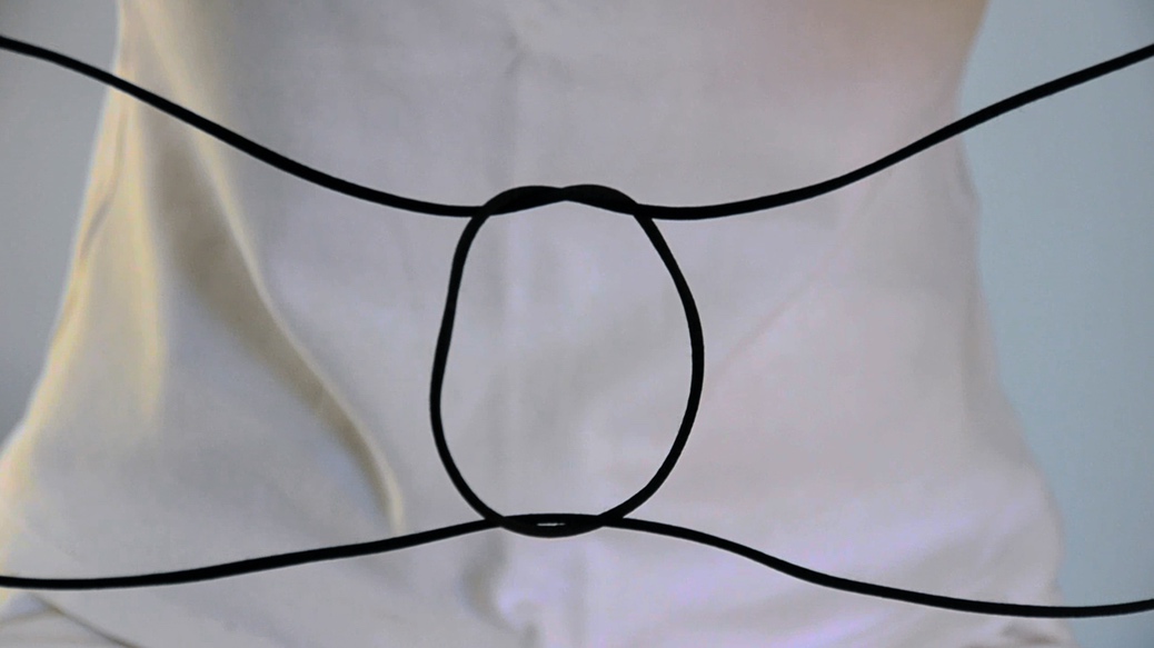 © Eva LootzDurante el trascurso del vídeo se realizan diferentes figuras que evidencian las similitudes entre estas prácticas y los conceptos propuestos por Lacan. El proyecto «Entremanos» proporciona una comprensión más amplia de la relevancia de los nudos en la vida social y cultural, además de contribuir a la comprensión de las implicaciones psicoanalíticas asociadas a los mismos. Esta conexión invita a reflexionar sobre las diversas dimensiones de la condición humana y cómo se manifiestan tanto en la práctica lúdica como en el entramado teórico propuesto por Lacan. Además, la artista destaca su estudio sobre las ramificaciones culturales y literarias de las cuerdas y los nudos en la cultura occidental contemporánea. Reconoce que los juegos infantiles son un importante legado de la memoria colectiva de la humanidad y ha utilizado fragmentos de esta memoria en su trabajo. También menciona el nudo presente en ciertas figuras retóricas del lenguaje y explora las implicaciones narrativas y musicales en el arte y la literatura. En suma, el proyecto «Entremanos» de Eva Lootz se basa en la exploración de los juegos de hacer nudos en diversas sociedades y, relacionándolo con la teoría lacaniana, muestra las implicaciones antropológicas, culturales y psicoanalíticas de los nudos, tanto en la práctica lúdica como en la teoría conceptual (Solans en Lootz 2012).