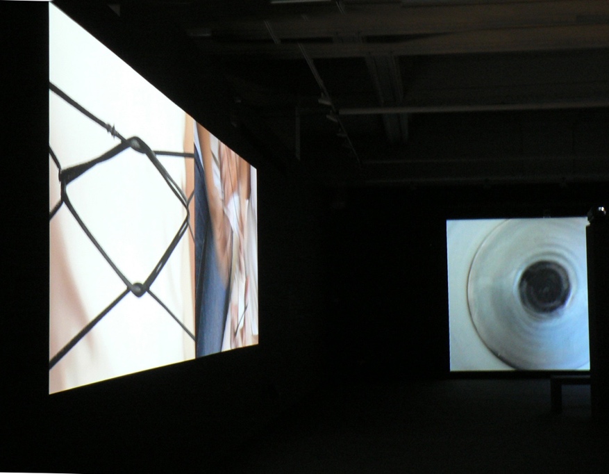 El video de «Entremanos» se presenta en dos pantallas adyacentes pero también se exhiben en la exposición otras dos obras en vídeo. A la izquierda, se encuentra una obra titulada No es más que un pequeño agujero en mi pecho, inspirada en un verso del poema He nacido agujerado de Henri Michaux (2018). El vídeo se caracteriza por mostrar un solo plano en el que aparece un gran agujero en el que cae arena finísima hacia un espacio vacío y negro, en un bucle continuo. A la derecha, se encuentra blind spot (punto ciego) que se basa en un hecho fisiológico ya que en el ojo existe un punto en el que no se puede ver, el punto en el que el nervio óptico se encuentra con la retina. Esta obra señala que, debido al condicionamiento cultural, hay ciertas cosas que no se perciben, en concreto, se alude a que la mujer ha permanecido en el ángulo ciego durante milenios7. Estas tres obras que se encuentran juntas en la exposición «Nudos» invitan al espectador a reflexionar sobre las limitaciones perceptivas y culturales en relación con la mujer.
