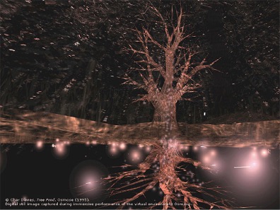 de Char Davies (1995). Entorno virtual inmersivo con uso de la semitransparencia en tiempo real e interfaz de usuario basada en la respiración y el equilibrio que permitía a los usuarios tener la sensación de ingravidez entre paisajes translúcidos.