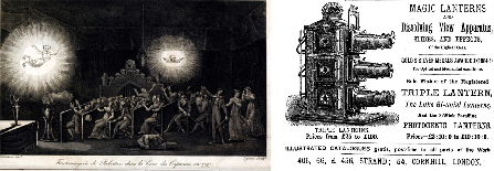 Ejemplo de un espectáculo de fantasmagoría en la primera imagen. En la derecha, el aparato para realizar estos efectos visuales con posibilidad de fundido encadenado entre tres imágenes.