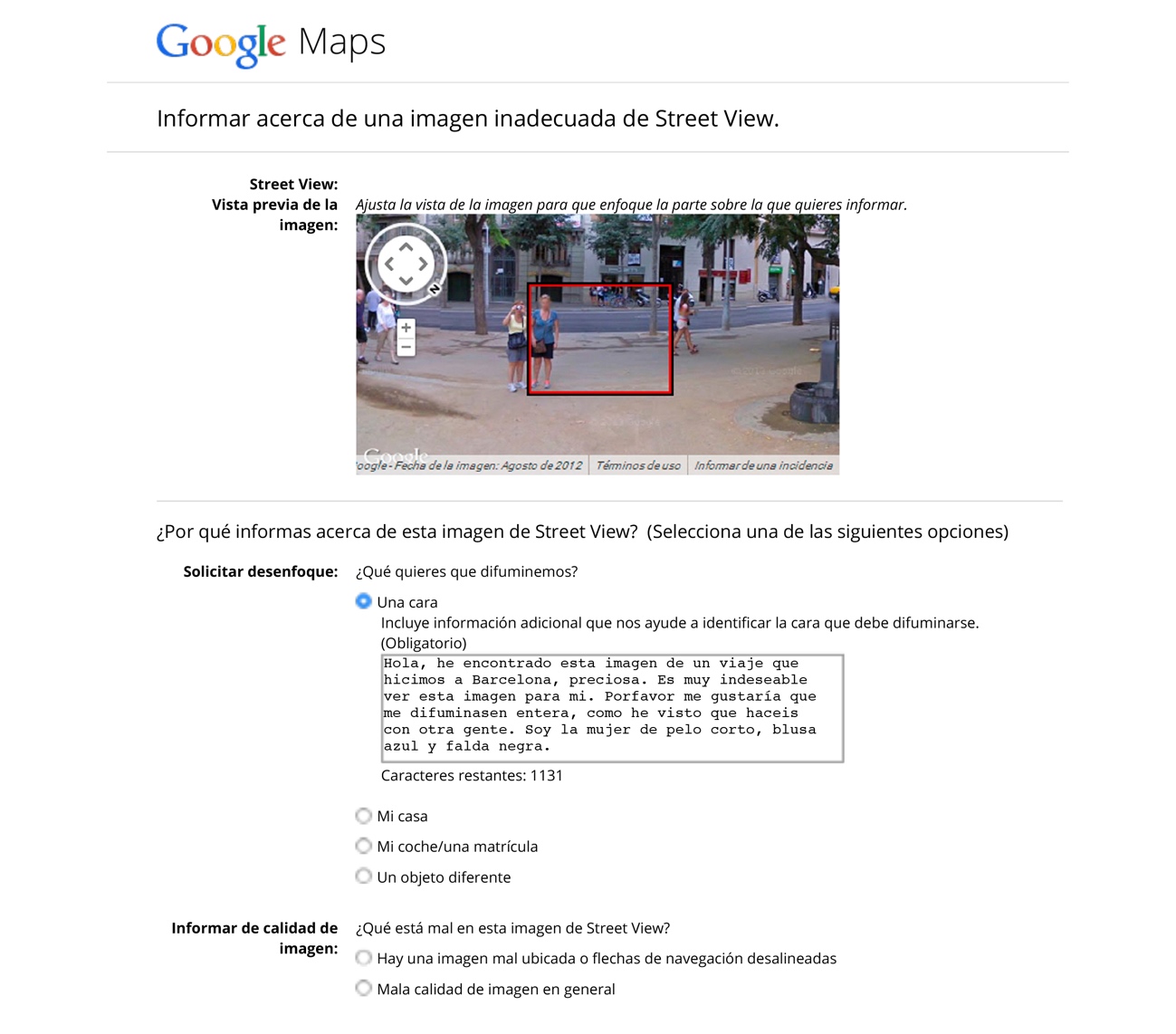 A partir de esta premisa –la de alterar de algún modo el entorno virtual de Street view–, en 2014 comenzamos a realizar el proyecto «Out of focus», un trabajo basado en una serie de intervenciones realizadas sobre la plataforma de Google, que principalmente consistía en modificar diversos elementos de su entorno. Así, a través de un formulario de contacto que Google proporciona a sus usuarios para pedir difuminar las vistas de su cara, vehículo o casa (el formulario 'informar de un error', fig. 1), se difuminaron numerosos elementos mediante falsas identidades e historias ficticias. Lo notable de estos elementos alterados, es que se encuentran permanentemente difuminados en las vistas correspondientes de Google street view, y el tiempo que estas intervenciones permanezcan visibles dependerá de la capacidad de refresco de la plataforma, esto es, del tiempo que pueda tardar la compañía en volver a fotografiar y mapear los lugares de las imágenes intervenidas, pasando así a formar parte del pasado virtual de las vistas de Street view8.
