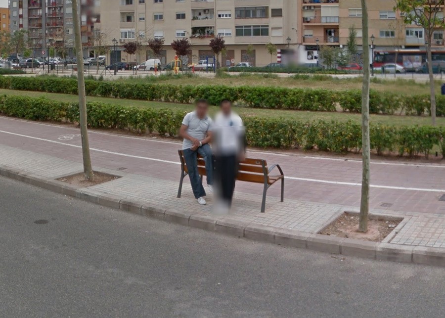 De este modo, desde la que se puede considerar como la primera intervención artística en la plataforma realizada por los artistas Ben Kinsley y Robin Hewlett con «Street with a view» (2008)2, son numerosos los proyectos ejecutados a partir del famoso servicio de Google. Trabajos como «9-eyes» de Jon Rafman (2008-actualidad)3, «The Google trilogy» de Emilio Vavarella (que incluye «Report a problem», «Michele’s story» y «The driver and the cameras», 2012)4, «Street ghosts» de Paolo Cirio (2012-2017)5, «Anonymous gods» de Marion Balac (2014)6 o «Trolling Google art project» de Mario Santamaría (2013-actualidad)7, —entre otros muchos—, convierten a los artistas en rastreadores en busca de imágenes que visibilizan los errores de la tecnología cuasi perfecta de Google, que en parte se deben a los automatismos que rigen el proceso de mapeado y procesado de las imágenes que escapan al control humano; en otras ocasiones ciertos proyectos se centran en rescatar imágenes captadas de forma involuntaria por los dispositivos de los vehículos de Google y que muestran curiosas escenas de la vida cotidiana, en un ejercicio de renovación del famoso 'instante decisivo' de Cartier-Bresson; desde otros planteamientos, se intenta reflejar la relación entre el individuo y los sistemas de poder que imperan en Internet, profundizando en la correspondencia entre la realidad física y la virtual. En cualquier caso, son pocos los proyectos que consiguen realizar una intervención en el sentido de 'modificar el espacio' virtual. La mayoría de los trabajos apuntan a la vía de la búsqueda de imágenes, recolección y su posterior clasificación: accidentes de tráfico o catástrofes naturales, glitchs y errores de procesamiento, reflejos que muestran los dispositivos ópticos de Google, estatuas desenfocadas debido a que el sistema las identifica como rostros humanos o imágenes que muestran los límites del territorio explorado, es decir, aquel punto donde los vehículos de la compañía no han podido acceder.