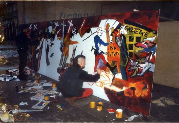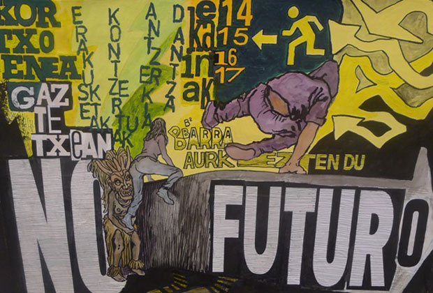 Fotografía cedida por el artista DetritusEl artista, ha sido y es un referente del contexto del punk vasco. Dentro de nuestro territorio, el punk surgió (no podría haber sido de otro modo) aprobada la constitución española tras la muerte del dictador Franco y tras el periodo de transición. Sería a partir de los años 80 principalmente cuando comenzaron a proliferar bandas de grupos punks por nuestras fronteras como los arriba mencionados Eskorbuto, Cicatriz, Zarama, La Polla Records, RIP o Vómito Social, entre otros. A nivel artístico surgirían espacios alternativos para las artes como Arte Nativa o Safi Gallery. Dentro de ese marco, Detritus, fue reconocido por su obra de carteles de carácter reivindicativo. El artista ha sobresalido desde los años ochenta por su implicación con movimientos contraculturales con los que hoy día, y de vez en cuando, sigue colaborando. Su plasticidad, parece afín al expresionismo de principios del siglo XX por la subjetividad y las capacidades expresivas de sus figuras, que mezcla con eslóganes vitales impregnados de aires nihilistas dotando a las obras de cierto espíritu ‘anti’. Detritus llena sus creaciones de una rareza y un sobrecogimiento que roza lo poético, a través de figuras, a menudo deformadas, agrandadas o agredidas, que transmiten profundas sensaciones y emociones de tono existencial.