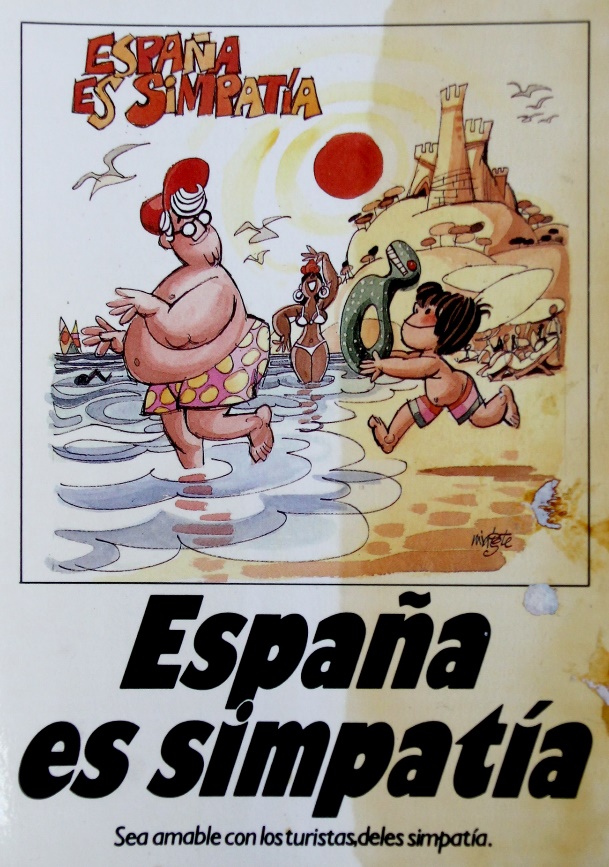Pero no solo el interés común por ciertos referentes o imágenes codificaron el legado identitario. También el carácter y el trato hacia el visitante sirvió como estrategia institucional y política para la definición de España como país que reconfiguraba su economía en base al ocio y el entretenimiento. La mítica frase de Carlos Solchaga, ex ministro del primer gobierno socialista de Felipe González «a mejor política industrial es la que no existe», se convirtió en todo un hecho con la especialización del país hacia el sector servicios y el desmantelamiento industrial: «nuestro país no puede, ni debe competir con el resto de las naciones europeas en los grandes temas industriales. Su futuro está en el sector servicios, y dentro de él, el turismo» (Heras 1984). Ante dicha situación3 campañas como España es simpatía surgieron en los años ochenta como mecanismo para instaurar la noción oficial de la hospitalidad (fig. 2).