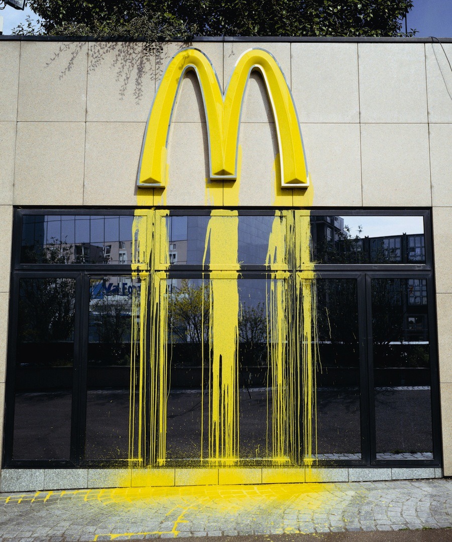 © ZevsLas ex-infames Guerrilla Girls ya son parte normalizada del sistema arte pues tienen sus afiches bien colocados en los mejores y más trascendentales museos de arte contemporáneo del mundo (Centro Georges Pompidou: planta 4 pasillo central). Banksy se subasta en forma exponencial y mediática entre Nueva York y Londres. El sistema arte ha sabido silenciar e integrar a los disidentes del mundo de un modo plenamente eficaz y ulterior. Esto sólo puede hacernos mirar con nostalgia a los idealistas como el cordobés Equipo 57 que otrora allá por 1959 seguían contumaces con la vanguardia utópica modernista que se niega a firmar sus obras y pedía -vía manifiesto14, una tasación idéntica por metro cuadrado de los lienzos para todos los artistas del mundo. En fin… Mucho más tarde, el —aún— grafitero anónimo francés Zevs tiraba pintura sobre los logos de las grandes marcas en plena calle (Mcdonalds, British Petrolum, Chanel…), hasta que las marcas pasaron a invitarle como host star a sus soireés donde ahora hace ready painting actions (pero indoors). Pasando por caja, of course (darling).
