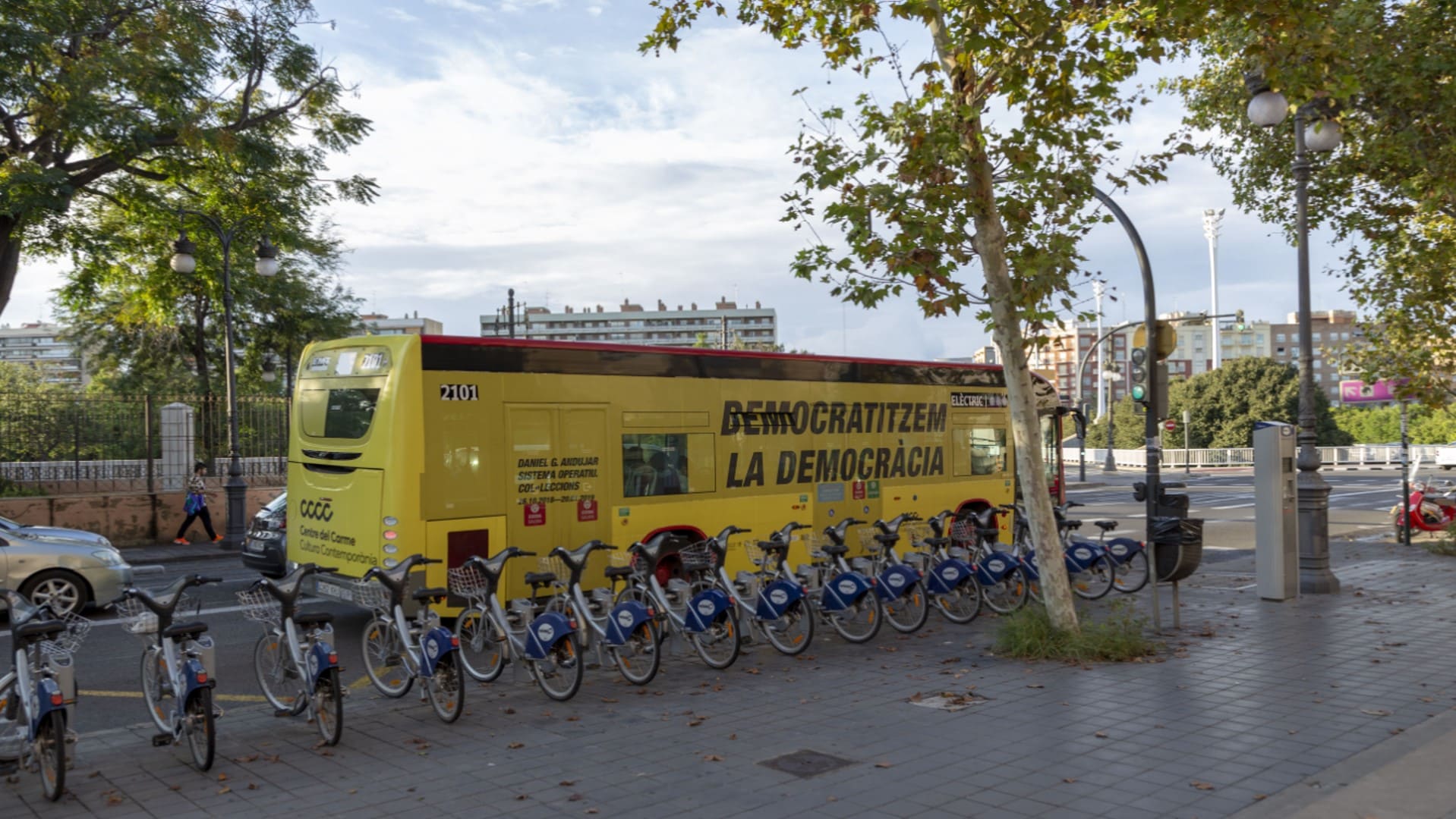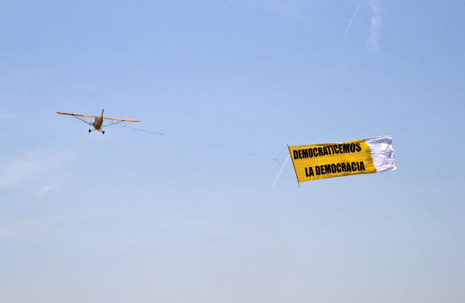 Muchos ayuntamientos e instituciones disponen de un porcentaje para la comunicación de sus campañas, y también son cada vez más los museos y centros de arte que deciden alquilarlos tanto como elementos de comunicación como para mostrar trabajos artísticos que dialoguen con su entorno. En esta línea, recientemente podíamos encontrar en las calles de Valencia autobuses con el mensaje «democraticemos la democracia», un proyecto de Daniel García Andújar (fig. 2) con motivo de su exposición individual en el Centre del Carme Cultura Contemporània (2018). Estos mensajes se podían leer en 2011 en la costa del levante insertados en otro elemento de publicidad exterior, una avioneta (fig. 3). Este soporte podemos encontrarlo en las playas anunciando formas de ocio como un restaurante o un parque acuático pero, en esta ocasión, contextualizado en un momento de eclosión del 15M, nos invitaba a pensar en torno a una cuestión latente en el ambiente: el sistema democrático español.
