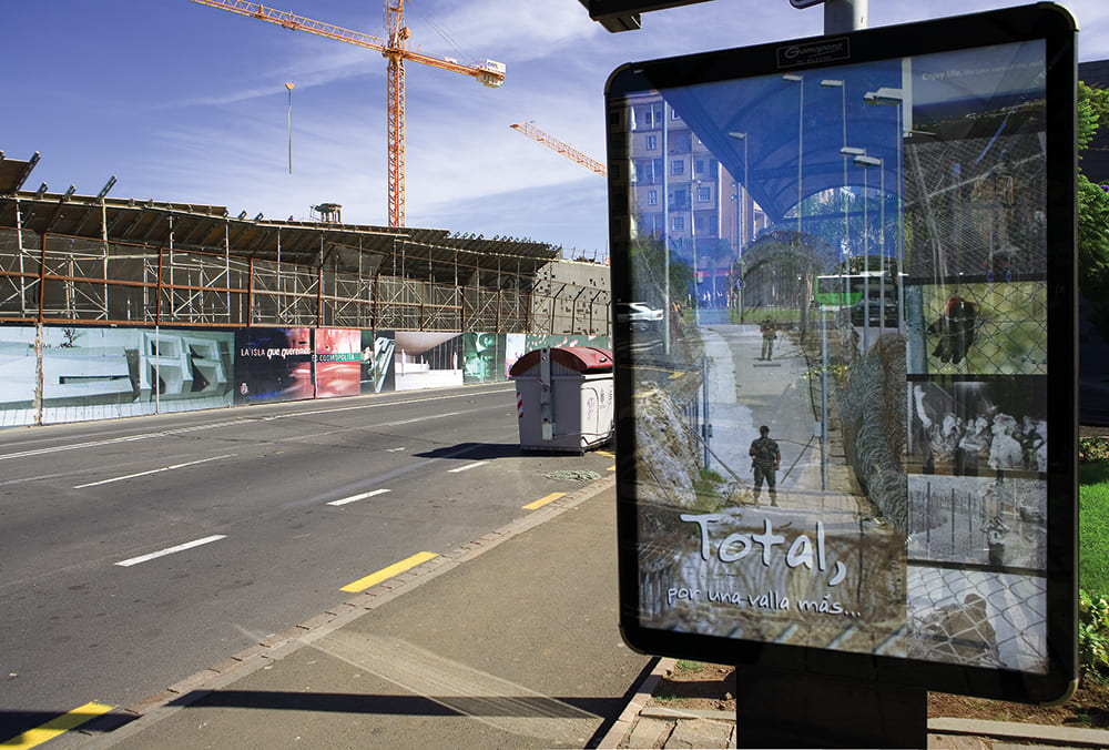 Cortesía del artistaRogelio López Cuenca a través de su práctica artística se sirve con regularidad de estos elementos de publicidad exterior. En «Total» (2006), parte de la campaña del Ministerio de Medio Ambiente del año 2005 para, desde la ironía, lanzar una crítica directa a una problemática en la que estaba, y continúa, inmerso nuestro país. «El total es lo que cuenta», rezaba la campaña original, mientras en las piezas de López Cuenca leemos lemas como: «total, por un megapuerto industrial de nada…», «total, por unos campitos de golf…», «total, por una montaña menos y unos pocos millones de euros más…», «total, por otro edificio singular…», «total, por una valla, más…». Las intervenciones estaban enmarcadas en la I Bienal de Arquitectura y Paisaje de las Islas Canarias en el año 2006. Estos carteles se insertaban en los mupis y marquesinas de la ciudad para analizar, desde estos espacios ubicados en las calles, las problemáticas ligadas al boom inmobiliario desde dentro, desde un escenario institucional, una bienal de arte contemporáneo (fig. 5). La especulación política, la inmigración o la política turística y territorial se ofrecen de una forma en la que podrían llegar a pasar desapercibidas e incluso confundirse con su campaña real pero, si nos detenemos vemos cómo las imágenes que la acompañan y sus mensajes son totalmente diferentes. Esto hace que estos soportes adquieran en este tipo de acciones un componente añadido al permitir lanzar estos mensajes, camuflados por las estrategias propias de la publicidad, en un contexto cotidiano, donde el público no va con una predisposición a ver arte sino que simplemente lo lee del mismo modo que otro tipo de campañas publicitarias.