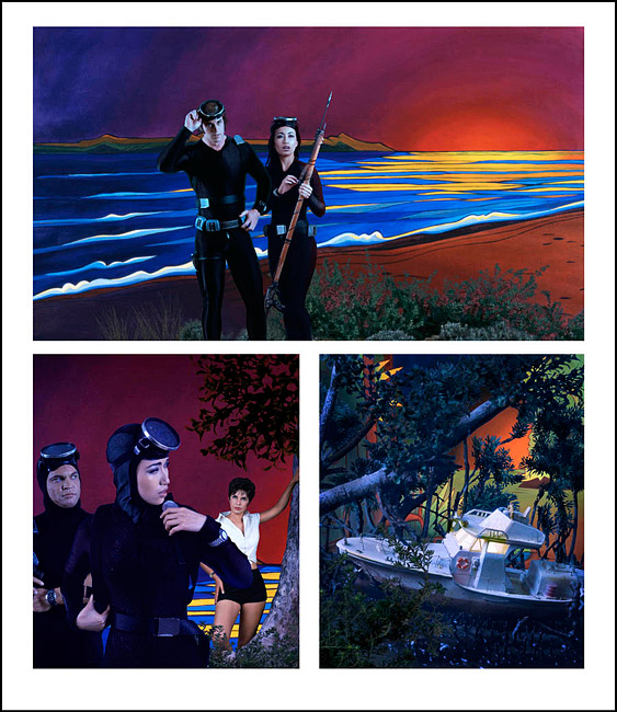 En «Adventure series#1» la fotografía superior consiste en un plano general —lo que podría llamarse en el argot cinematográfico como ‘toma de situación'— que da una idea de dónde suceden los hechos: una pequeña avioneta sobrevuela un desierto, un paisaje de formas surrealistas pintado de colores estridentes se une a los muchos elementos usados por la autora para alejarnos de forma consciente de la realidad. No es difícil encontrar la conexión formal con los dioramas, la estética de las revistas pulp, o el ya mencionado ‘mundo Disney’.