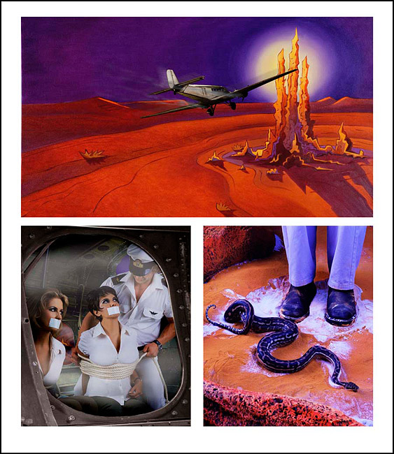 http://www.roslynoxley9.com.au/artists/26/Tracey_Moffatt/306/32771/La segunda imagen, ya situada en la zona inferior, nos presenta lo que se supone que veríamos a través de una de las ventanillas de la avioneta: dos mujeres atadas y amordazadas por un hombre al cual no se le ve la cara. Los tres personajes llevan uniforme, esto nos indica que podrían ser miembros de la tripulación. La visión a través del ojo de buey nos hace posicionarnos en el lugar de un voyeur. Además la autora adereza la escena con elementos bastante recurrentes de la erótica universal también usados en otras series como en «Something more» (1989) y más concretamente en «Laudanum» (1999) en la que utiliza algunas referencias a perversiones sexuales como el sadomasoquismo, en el caso de «Adventure series» parece que, emulando a las series de televisión, las lleva hasta la parodia.