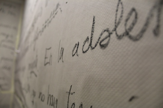 En la figura 8 se puede ver las imágenes de la práctica artística. La cabina del baño empapelada, en la que se comienzan a reproducir en audio, de forma encadenada, las historias de vida recogidas durante el trabajo de campo. Las mismas, son reproducidas gráficamente por los artistas 'visitantes' de ese espacio. De esta forma, y tomando como referencia la parte lingüística del lenguaje como código, la acción de escribir se convierte en acción artística y el gesto gráfico se convierte en filtro, es decir, los sentidos recogen la información, el cuerpo es el nexo y el creador de esa codificación a través de la escritura, como manifestación de que las cuestiones han pasado por la parte interna o racional.