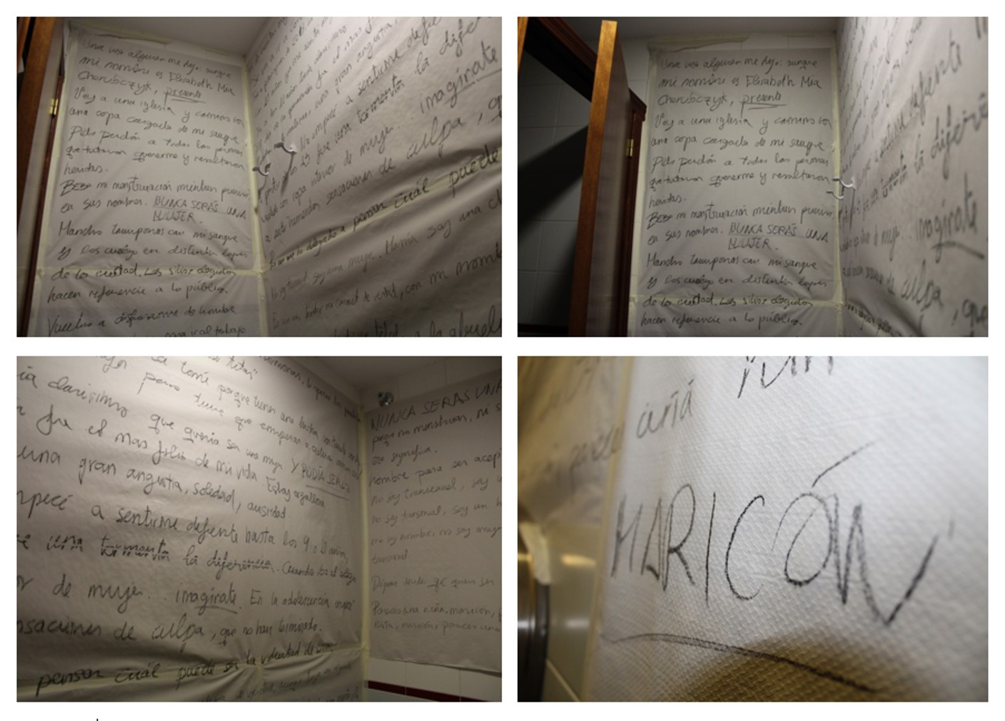 ¿Qué es lo masculino y lo femenino sino posiciones culturales y sociales limitadas por la lingüística como código? El código se utiliza como vehículo de comunicación, como filtro entre el sujeto artista y la participación activa de las experiencias trans, que convierten el espacio vacío, el baño, en un lugar identitario, compuesto por las experiencias que pasan por el filtro sensorial del artista, asimilándolas, tomándolas como suyas.