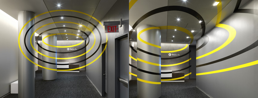 En la obra de Varini, la oposición entre la figura plana intangible que se percibe desde un punto de vista concreto, y el fondo, se basa en que la primera (proyectada en una pantalla virtual) sobresale sobre un fondo en segundo plano (el espacio tridimensional). Este efecto es posible por la imposición de un punto de visión inmóvil, que funciona como punto de proyección de la imagen misma, que al mismo tiempo necesita de una visión monocular para ser visualizada sin distorsión alguna. Esto nos lleva a la relación existente entre la anamorfosis y la perspectiva6. Y es que el antecedente directo de la anamorfosis puede encontrarse en las perspectivas aceleradas y desaceleradas, entendidas como variaciones de la perspectiva matemática del Renacimiento que distorsionan la sensación espacial del observador. En el trabajo de Felice Varini es la visión la que sintetiza la información y nos permite creer una bidimensionalidad donde realmente existen tres. Permitiendo la convivencia de la segunda y la tercera dimensión. «l'espace concret et l'espace abstrait, l'espace 'réel' et l'espace de l'art (de la fiction), etc.7» (Fibicher 2018).