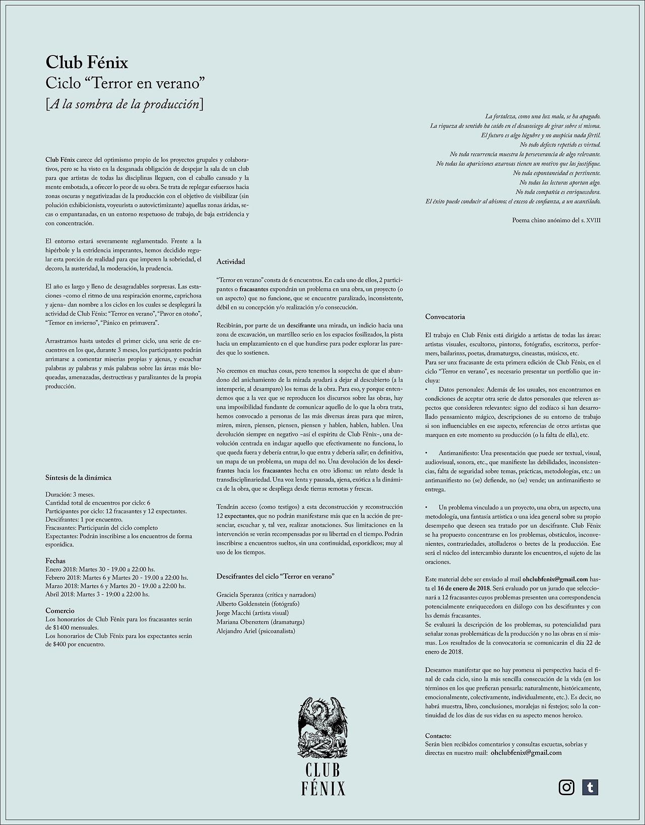Organizado en seis encuentros por ciclo que tienen lugar cada quince días, se desarrolla en Buenos Aires, Argentina, a lo largo de cuatro ciclos diferentes: 'Terror' en verano, 'Pavor' en otoño, 'Temor' en invierno y 'Pánico' en primavera. En los enunciados de cada ciclo se dejan ver ya los intereses y signos de la deriva del Club Fénix, humor y cierto desafío a los miedos que operan en la sensación de fracaso de todo proceso creativo.