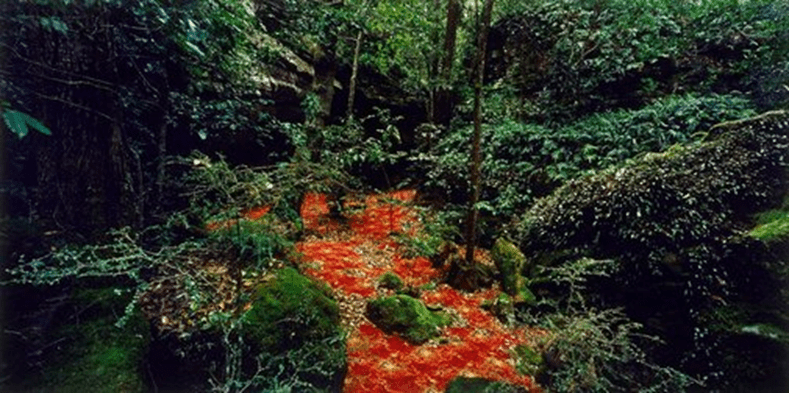Otras veces, el regreso al bosque es un intento de recuperar la sacralidad olvidada. Así aparecen, en la obra de Ian Hamilton Finlay titulada «Five columns or Cortot Saint-Just» (1982), en la «Cattedrale vegetale» de Giuliano Mauri (2001), o en los numerosos santuarios que ha creado hermann de vries en las últimas décadas y que se basan en la idea de no intervención. Hay ejemplos en los que se pone el acento en la presencia de lo artificial en cualquier paraje del planeta. Este fue el discurso que Rosemary Laing abordó en «Groundspeed (Red piazza)» (2001), unas fotografías en las que se apreciaba un entorno aparentemente salvaje cuyo suelo era una alfombra industrial. Aparecía una naturaleza marginada por la actividad humana con un lenguaje plástico inquietante que evidenciaba, al mismo tiempo, la artificialidad y el misterio impenetrable del bosque que solo se puede leer a través de símbolos o imágenes construidos por la cultura.