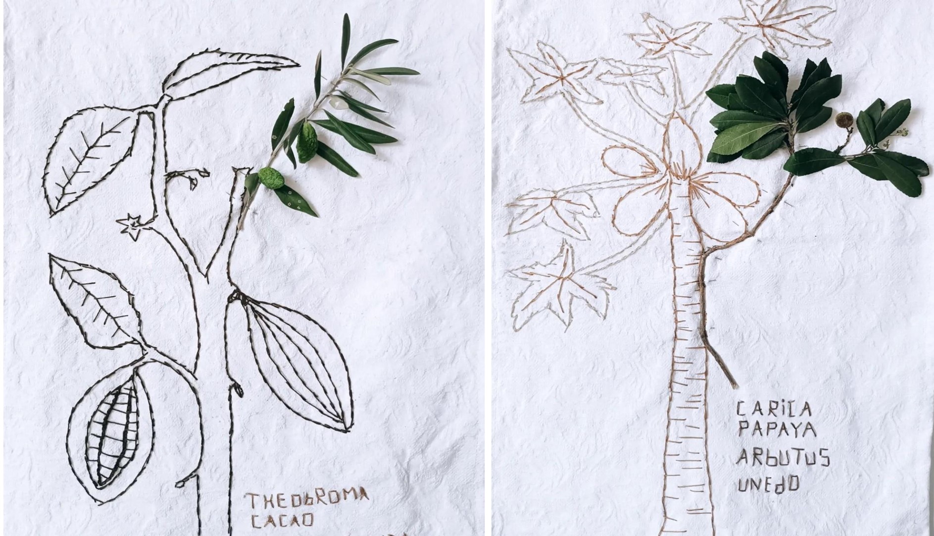Fotografías cortesía de la autora del trabajoEsta estudiante diseñó una serie de imágenes donde trataba la idea de regeneración. Trajo a clase el libro de Michael Marder Injertos (2019). En este texto encontró y compartió con el grupo la metáfora de la ‘simbiosis’, como una tendencia a asociarse para encontrar provechos comunes. En las dos imágenes que elaboró utilizó paños blancos como soporte para la imagen, como una alusión a la superficie hegemónica de la modernidad, pero estos fueron presentados sin tensar ni preparar ni pintar. En la tela arrugada proponía el encuentro de materias heterogéneas, el vínculo entre unas ramas recién cortadas y un bordado de dos siluetas y dos nombres tomados de la botánica europea. En una de ellas aparecía el término theobroma cacao y, en la otra y con similar composición, carica papaya. Las dos figuras de las plantas eran mostradas después de sufrir un figurado ‘injerto’ (figs. 1-2). Una metáfora que variaba la propia definición de injerto para, en este caso, unir lo orgánico con lo inerte. Una puesta en escena con ciertas variaciones que tienen lugar cuando lo disciplinado se confronta con lo vivo. También, el resto del grupo compartió sus propias experiencias y ensayos, dándose una variedad de propuestas con múltiples conceptualizaciones que fueron presentadas en público para continuar el proceso hacia la segunda variación.