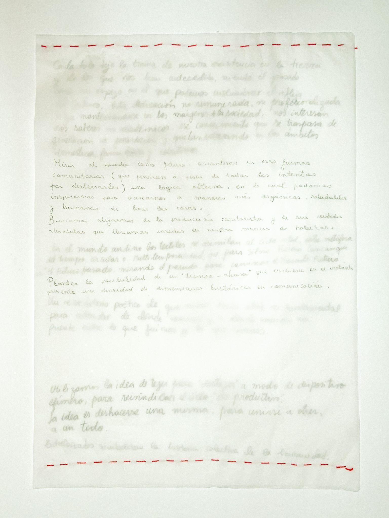 En segundo lugar, la variación mediante la mecánica transdisciplinar. Los grupos de dos o tres estudiantes pusieron en común sus diversas variaciones extradisciplinares (desarrollados en la práctica 1) sobre la base de la descripción teórica del concepto, en variación, de transdisciplinariedad. La reunión de experiencias supuso, al mismo tiempo, la síntesis de las variaciones disciplinares de la práctica 1 y la apertura a una nueva variación disciplinar. Los grupos de estudiantes abordaron temas diversos como la diferencia entre la vida urbana y la vida rural, los virus, la reordenación de los archivos familiares, etc. En el caso de la propuesta titulada «Las redes que nos tejen», realizada por uno de los grupos que se formaron, se partió de los aprendizajes previos en torno a las intersecciones extra-disciplinares establecidas por cada uno/a de los/as tres miembros del grupo. A pesar de las diferencias, los diálogos de cada estudiante tenían un elemento común: la idea de ‘no-productividad’. Dicha idea parte de la vindicación de un tiempo improductivo frente al tiempo productivo de nuestras sociedades capitalistas. Para trabajar la concepción de tiempo improductivo el grupo exploró las temporalidades otras y no eurocéntricas, en particular, la concepción de la temporalidad andina. El tiempo andino es un tiempo cíclico ligado a los procesos de la productividad agrícola. Según Josef Estermann «el principio cíclico sostiene que el Pacha (espacio-tiempo) se manifiesta en forma de una espiral, una sucesión periódica de ciclos regidos por los ritmos astronómicos, meteorológicos, agrícolas y vitales» (Estermann & Peña 1997, 197). Por otro lado, una de las prácticas cotidianas de las comunidades andinas es la práctica textil. En los textiles andinos cristalizan sus cosmovisiones, son verdaderos documentos socio-culturales, son una «una piel social» (Hernando Marsal 2015, 1033) ajena a las prácticas seriales de las producciones textiles del capitalismo. El textil andino puede entenderse como un constructo cultural improductivo y no capitalista, colectivo y lento, marginal y no remunerado sobre el que este grupo basó la práctica 2. De modo que el estudio de otros procesos ontológicos, estéticos y epistémicos, en este caso el de la temporalidad y el textil andino, forja una nueva variación.