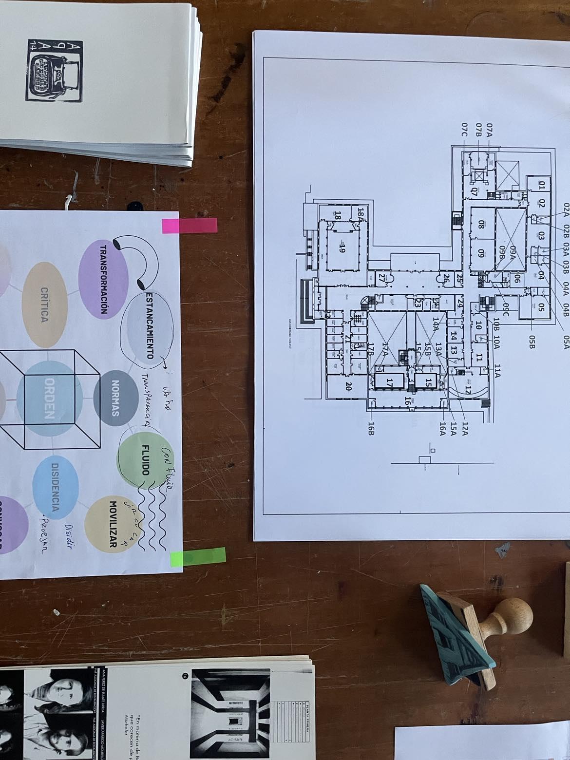 En cada sesión, se repartían tareas que ponían sobre la mesa en el siguiente encuentro. De este modo, fueron armando un corpus analítico durante todo el proceso. Desde los primeros descubrimientos junto a personas de fuera de la facultad, pasando por el trabajo hecho en equipo, fueron poniendo en común los posibles puntos de contacto. El grupo siguió diferentes itinerarios mediante lecturas y experiencias que formalizaban en esquemas. Esta herramienta habitual de los contextos académicos se completó con la inclusión y la mezcla de otras 'heteromaterialidades': dibujos, pequeños papeles con notas, imágenes recortadas (Jick 1979). En el aula instalaron una zona donde fueron colocando en un mural los tiempos, las tareas, los materiales teóricos, las referencias visuales, las palabras encontradas y, a partir de ellas, se iba tramando un índice de temas e iniciativas a llevar a cabo.