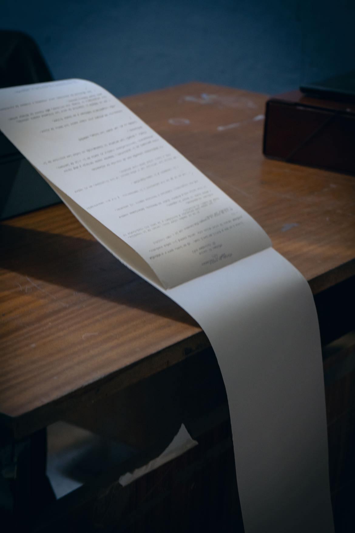 Escenificaron una ‘oficina de quejas’ que funcionó durante todo un día. Para ello, instalaron en el pasillo una mesa con una máquina de escribir donde tomaban nota de las quejas del alumnado, del profesorado y del resto del personal. En pocas horas, el rollo instalado en la máquina se iba extendiendo con todo tipo de reclamaciones (fig. 8). La recogida de datos se hizo mediante un documento cuyo formato había sido tomado de la ficha de matriculación en la asignatura. También, se ideó y elaboró un sello de los que habitualmente se utilizan como signo de validación, con él se figuraba una ‘certificación’ y era reformulado para repensar los actuales sistemas de validación y evaluación, donde las distintas individualidades compiten por la mejor calificación y se deja fuera la potencia de las estrategias en equipo.