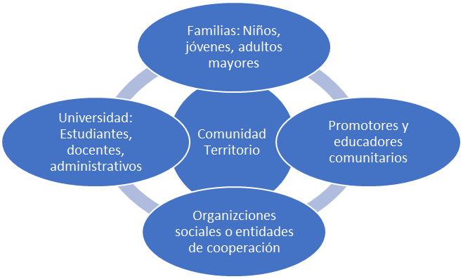 Bajo esta mirada las prácticas artísticas necesitan del dinamismo de barrios o comunidades interesadas en desarrollar estas actividades, mediante la gestión de sus dirigentes y el apoyo de organizaciones sociales, artistas y gestores independientes o de entidades de cooperación al desarrollo que se articulan para impulsar junto con la universidad estas actividades en el territorio en donde se prioriza la interrelación con la cotidianidad y realidad de la comunidad con todas sus fortalezas y potencialidades así como sus debilidades y amenazas que encuentran un medio de expresión en las prácticas artísticas y sus diversos lenguajes, para exponer y mostrar tanto al interior de la misma comunidad como al exterior su problemática social, sus formas de vida, sus desafíos, visiones y aspiraciones.