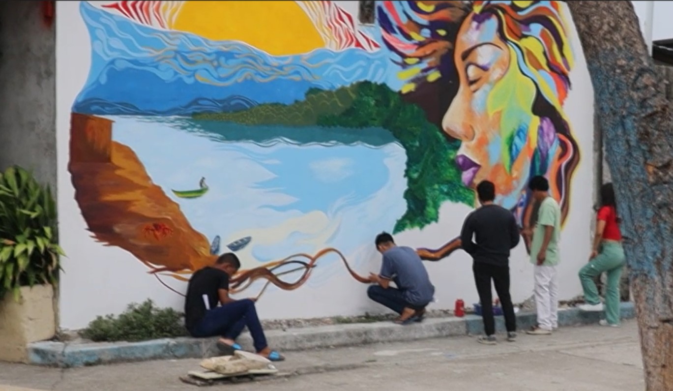 Mural en el sector conocido como el embarcadero de las canoas en Isla Trinitaria pintado por las artistas Maria Triviño y Maura Bazurto.