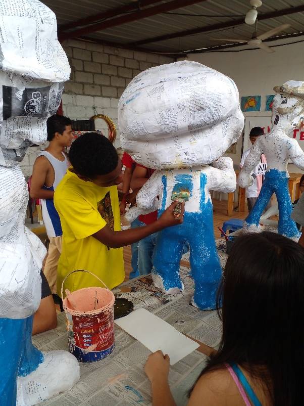 Adolescentes del barrio Desarrollo Comunal en taller de monigotes dirigido por Miguel León, estudiante de la Universidad de las Artes Miguel (originario de Isla Trinitaria).