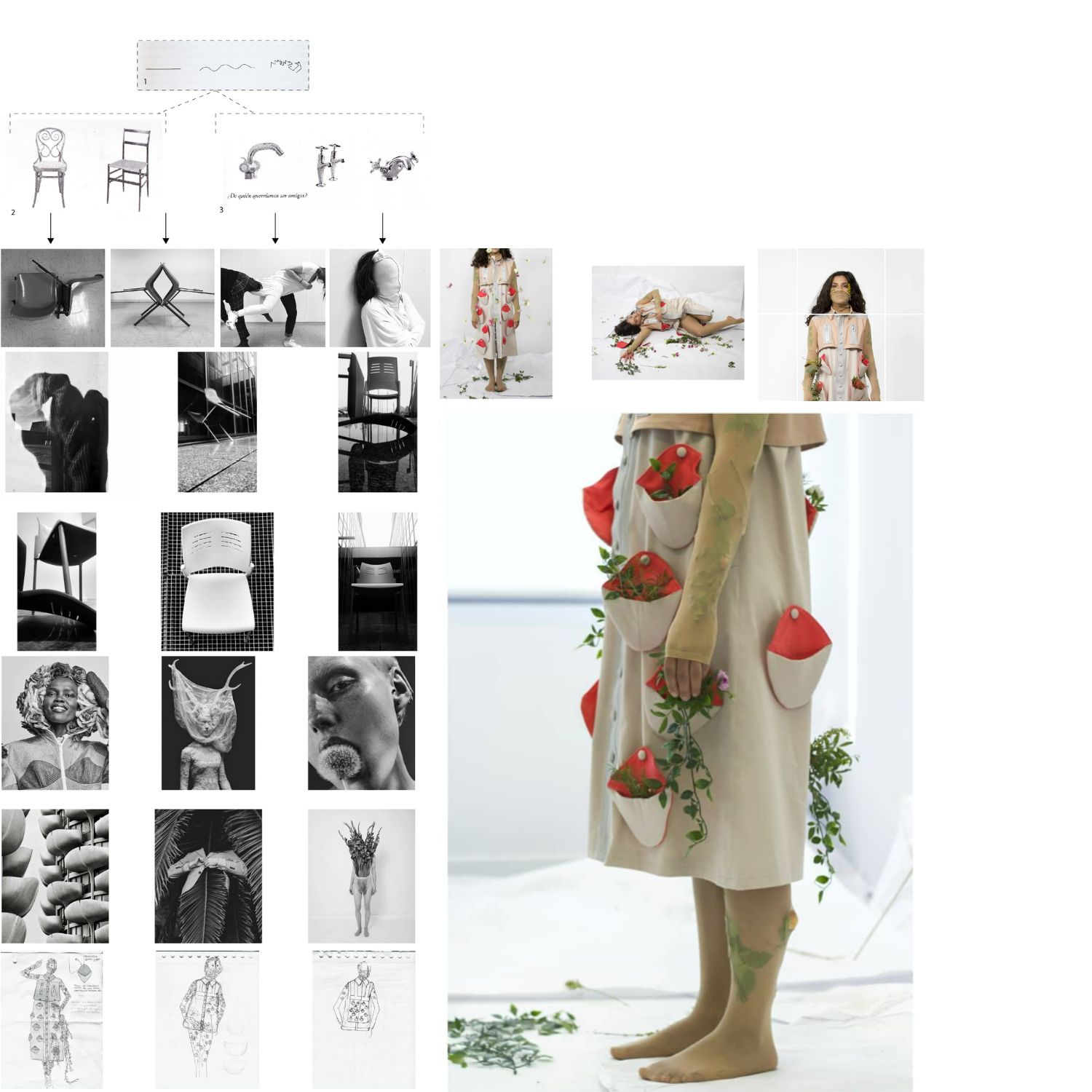 En la figura 1 se muestran los ejercicios realizados por la alumna Sofía Gómez en donde el proceso de investigación fue aumentando poco a poco su grado de dificultad. El primer ejercicio trataba de mostrar la capacidad de un elemento expresivo tan simple como la línea, de transmitir y comunicar diferentes tipos de personalidad e incluso hablar de relaciones humanas (Arnheim 1969). El carácter de una persona estable es posible representarlo a través de una línea horizontal, mientras que el de una persona agresiva se refleja en una línea compuesta dentada. Estas lecturas metafóricas y los ejercicios correspondientes fueron aumentando su complejidad de manera progresiva, trasladando este análisis antropológico a algunos objetos cotidianos: Dos sillas del aula enfrentadas, pueden reflejar entendimiento o conflicto, una prenda básica adquiere una apariencia escultórica a través de una acción performativa sobre experiencias extremas, o asociar un carácter humano a unos grifos y cuestionarse '¿de quién te harías amigo?' (De Botton 2006). En la segunda fase el alumnado comenzó a seleccionar referentes del mundo del arte y de la moda para posteriormente realizar un proceso de bocetaje que los llevase a la propuesta final (figura 2).