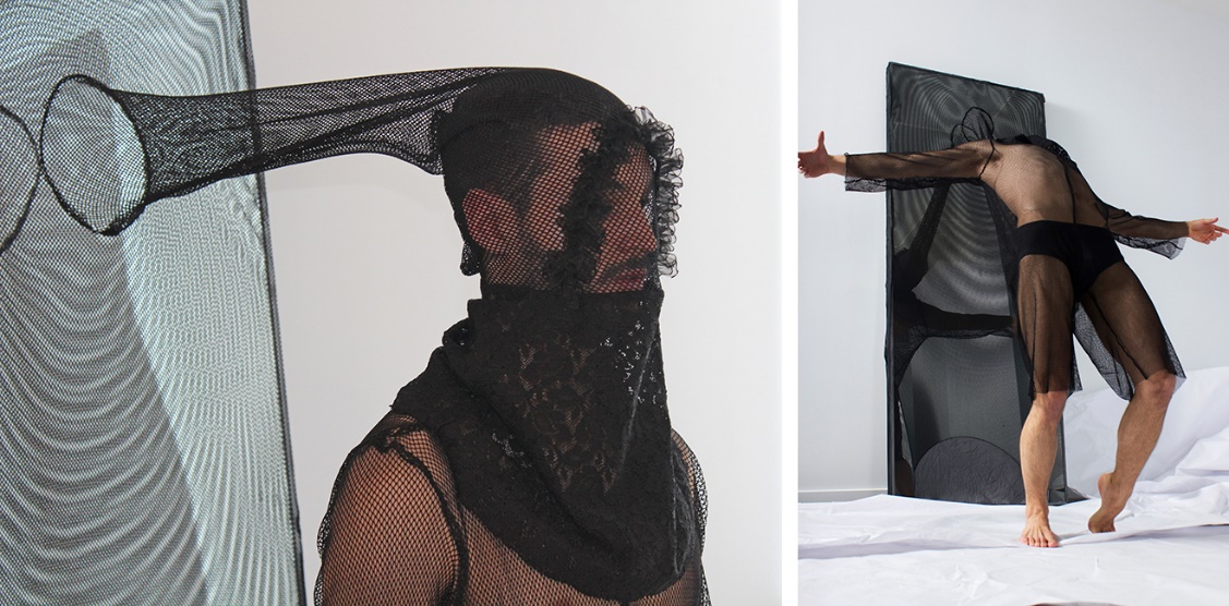 El primer ejemplo (figura 3) muestra un danzante unido a un espejo del que no se puede escapar; una crítica a la sociedad de la imagen y a la obsesión por una apariencia perfecta contaminada por la superficialidad de los cánones establecidos. El capuchón era independiente y era posible quitárselo para quedarse con un mono transparente.