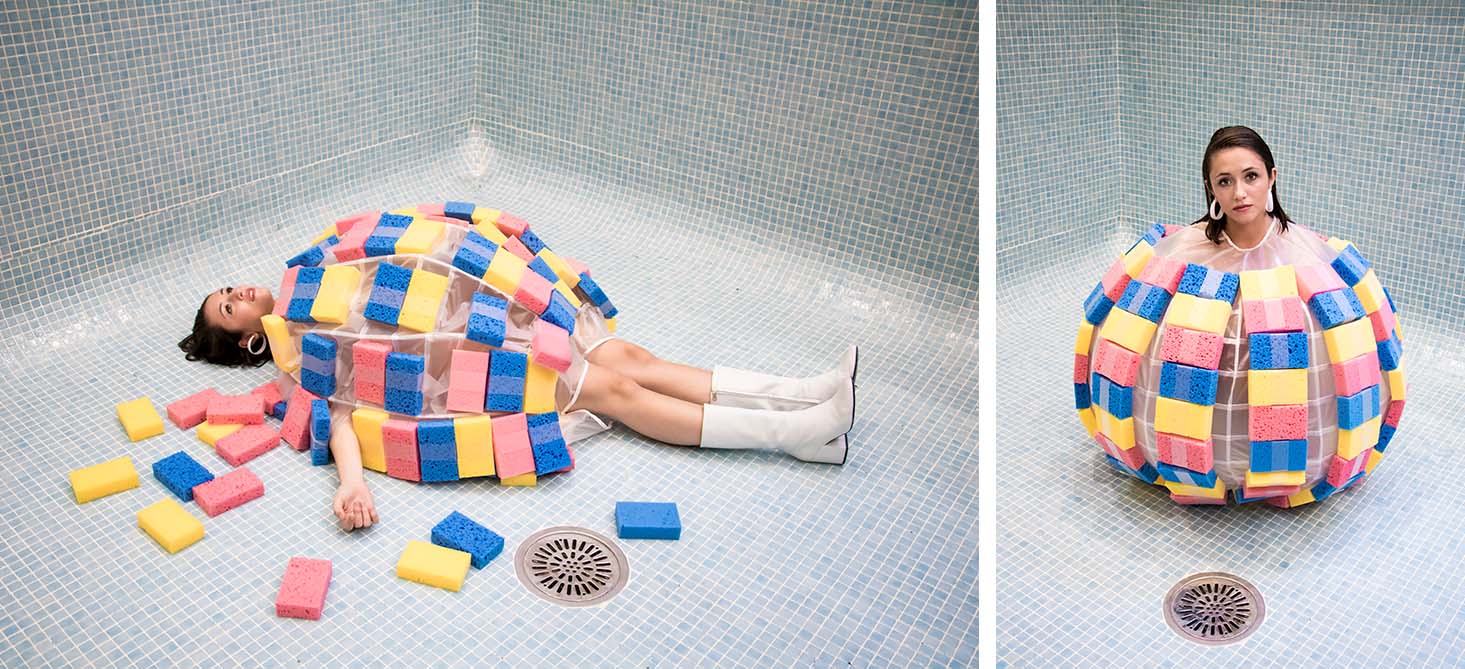 En la (figura 4) el objeto elegido era ‘la esponja’. Se presentaba de manera repetida a modo de estampado tridimensional, insertado en una estructura transparente de aspecto esférico. Trataba de reflejar la obsesión por la limpieza o ‘trastorno obsesivo-compulsivo de limpieza’. Retrataba una condición de salud mental caracterizada por pensamientos, imágenes o impulsos no deseados y recurrentes que llevan a comportamientos compulsivos que tratan de reducir la ansiedad causada por la propia obsesión. Pensamientos relacionados con la suciedad que derivan en una ansiedad extrema afectando a la vida diaria. Aunque el resultado no cumplió con los requisitos funcionales, conceptualmente y formalmente el alumno consiguió un resultado eficaz que le llevó posteriormente a mejorar sus diseños. En este caso se decidió no modificar la propuesta para cumplir con la utilidad de la prenda, ya que el perfil del alumno dominaba este tipo de competencias y se decidió por ser flexible para dejar experimentar con una manera de entender el diseño de moda más próxima al arte contemporáneo. El método proyectual en un tipo de docencia creativa no debe ser definitivo, sino flexible y modificable (Munari 1983), ya que está construido por medio del pensamiento divergente.