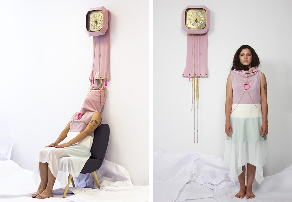 La siguiente alumna se unió al reloj de pared de su casa (figura 5). El ruido constante y repetido resonaba en su cabeza y lo relacionó con el aburrimiento y la sensación de que el tiempo pasaba muy lento. Esta vivencia puede estar conectada con varios fenómenos y trastornos. La procrastinación crónica está vinculada con esa sensación, ya que las personas que la experimentan tienen una percepción distorsionada del tiempo que los lleva al aburrimiento. La sensación de culpa, ansiedad, y la falta de compromiso con tareas relevantes puede convertir el tiempo libre en una experiencia vacía y tediosa. La alumna resolvió este reto creando un vestido cuyo cuello era extensible y tenía la posibilidad de unirse al reloj de pared para el que se había creado una funda a medida con el mismo material y color. La unión se resolvió con una cadena metálica haciendo referencia a la dificultad de poder escapar de una situación cotidiana concreta. Cuando la modelo se desprendía del reloj, se cumplía perfectamente con el objetivo funcional de una prenda capaz de ser usada diariamente.