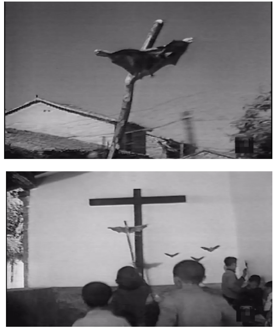 El niño entra corriendo en el pórtico de la iglesia seguido por el grupo de sus iguales y se coloca delante de una cruz que allí está colgada, contraponiendo a ella el murciélago. En esa misma pared hay un dibujo de tres murciélagos volando y otro niño dibuja un cuarto. En el espacio del pórtico de la iglesia se refuerza la idea de que los niños juegan a simular el vuelo con el animal muerto, ya que la síntesis entre la cruz de la pared, y los murciélagos dibujados, resulta en el juego del murciélago crucificado. La contraposición de imágenes para generar un sentido distinto al que cada una de ellas representa de forma individual, tan propia del lenguaje cinematográfico del montaje, como sería el caso de: