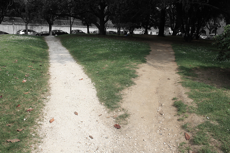 Los ‘caminos del deseo’ fueron objeto de estudio en una primera investigación contextualizada en la ciudad de Santiago de Compostela. El 29 de agosto de 2011 se llevó a cabo una acción in situ, denominada «Recorrido artístico por los atajos de Compostela»2. La naturaleza de estos como atajos adquiere una relevancia especial puesto que Compostela es el punto de llegada de todas las rutas del Camino de Santiago. Resulta evidente la enorme distancia entre el acto de atajar y el de peregrinar, esto es, el de recorrer en el menor tiempo posible un trayecto o alargarlo por motivos espirituales o penitentes. Esta circunstancia que dota a la iniciativa de un interés particular.