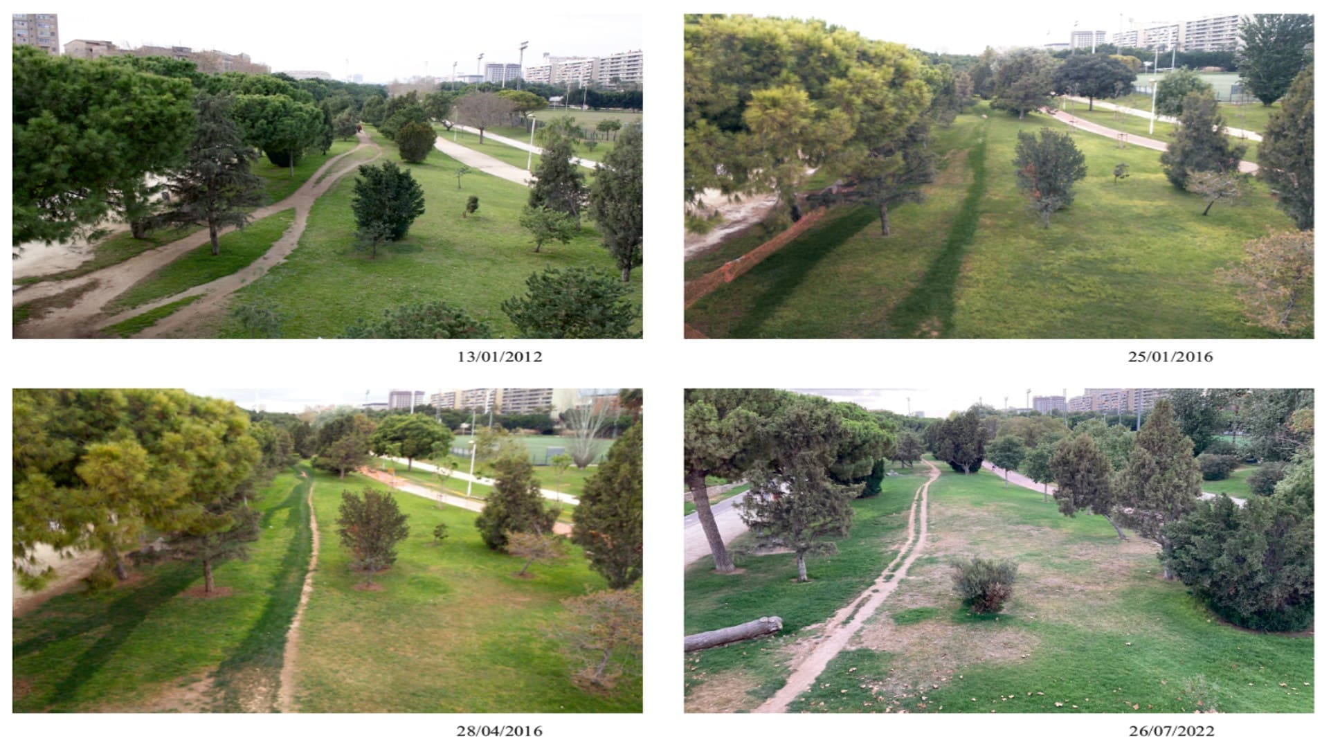 Si en Santiago concluimos que los ‘caminos del deseo’ respondían a una necesidad funcional al entenderse como atajos, estando concentrados mayormente en los campus universitarios y en hospitales, en Valencia extrajimos —resultado de diversas exploraciones llevadas a cabo sobre el terreno— que la naturaleza de dichos caminos está relacionada con una cuestión emocional vinculada al paisaje, puesto que los senderos localizados no acortan la trayectoria marcada sino que discurren paralelos a la misma, pero sobre el césped. En esta ocasión se concentran en el jardín del Túria emplazado en el antiguo cauce del río del mismo nombre cuyo curso natural fue desviado tras la gran riada de 1957. En ese contexto documentamos ejemplos significativos como las variaciones del trazado de un tramo de dicho ‘camino del deseo’ longitudinal, en especial el transcurso desde enero de 2016 cuando se toma la decisión de intentar eliminar el sendero y restituir el césped, surgiendo meses más tarde, de nuevo, el sendero por el mismo trazado. En 2022 se decidió inhabilitar, al menos, una bifurcación al disponer el tronco de un árbol caído. Aun siendo menos frecuentes, también se pueden encontrar en este contexto algunos atajos que recortan esquinas transitados, incluso, por bicicletas.